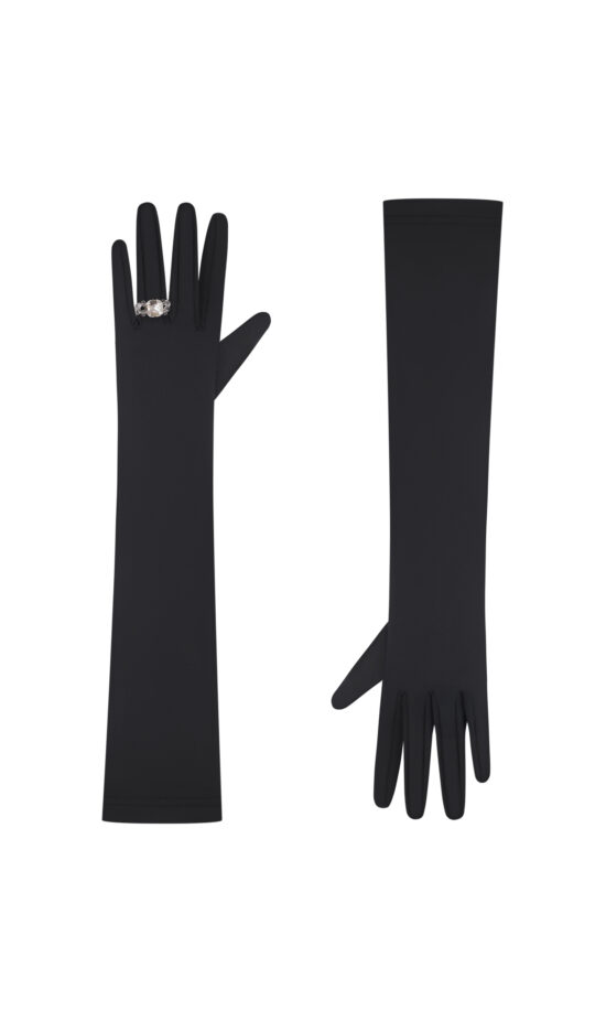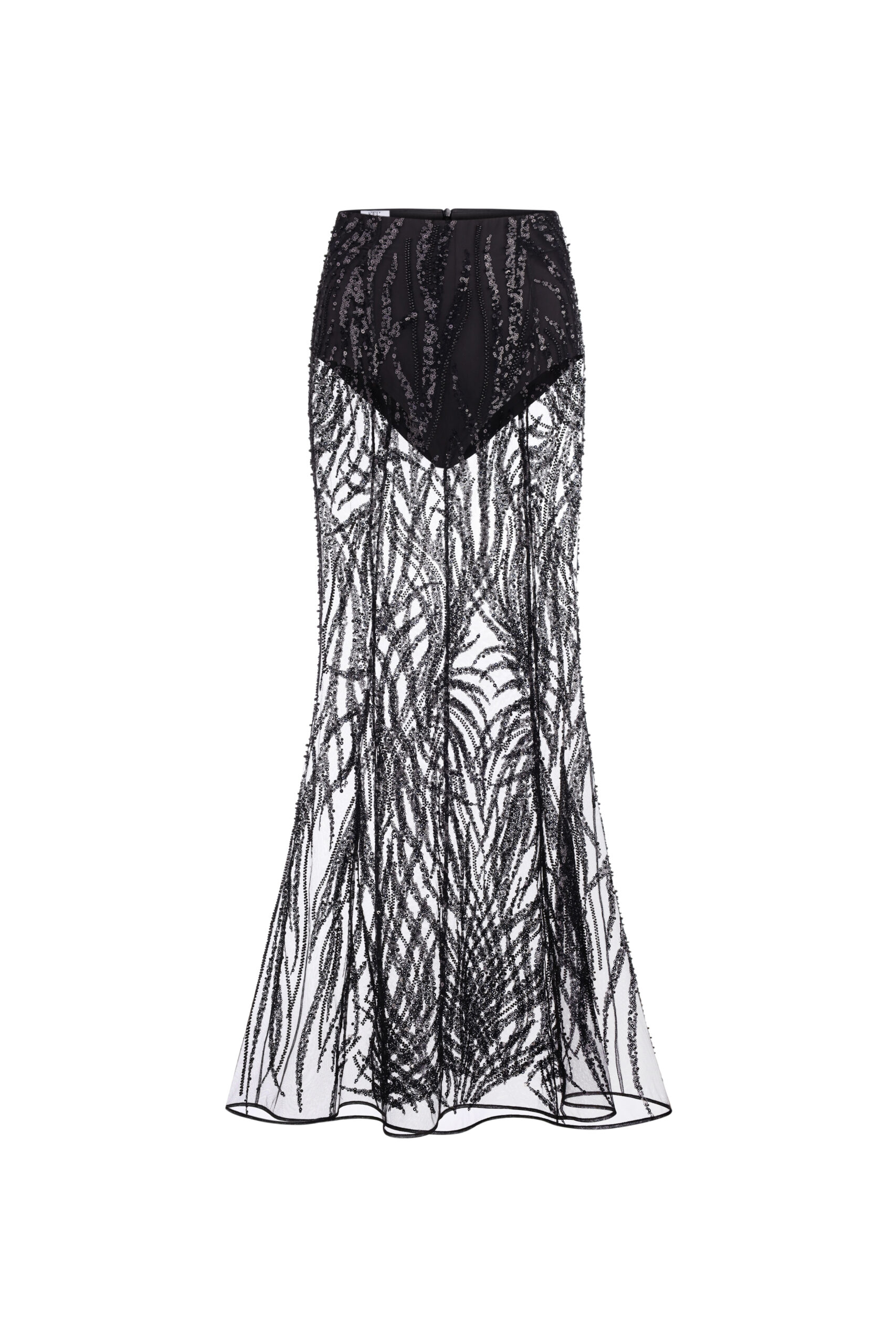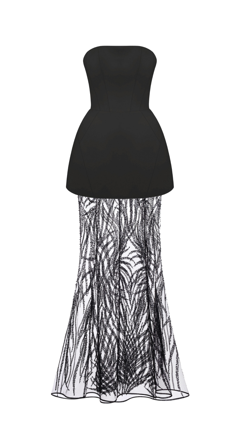Розкішний комплект в стилі haute couture з акцентом на корсетний верх, який надійно фіксує форму та підкреслює зону декольте. Легка напівпрозора спідниця прикрашена насиченим візерунком із чорних пайєток, що створюють ефект мерехтіння при русі. Для комфорту спідниця має вшиті шорти.