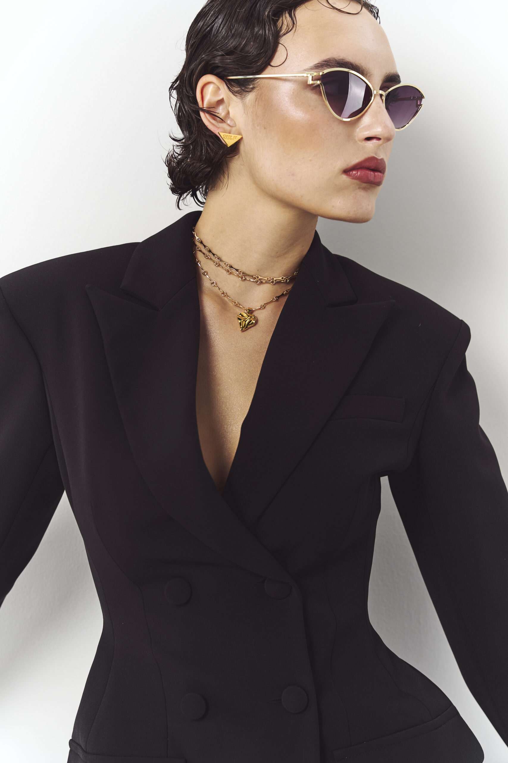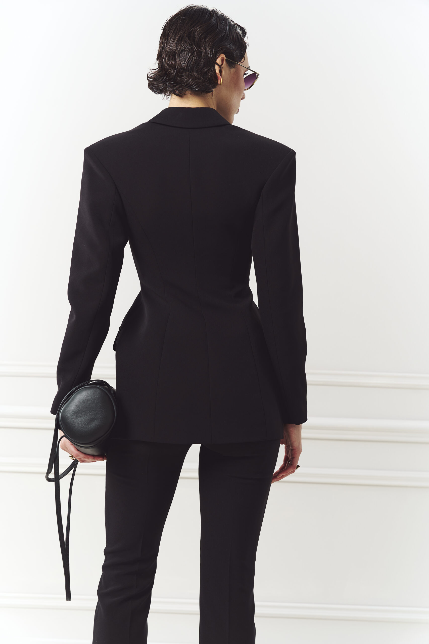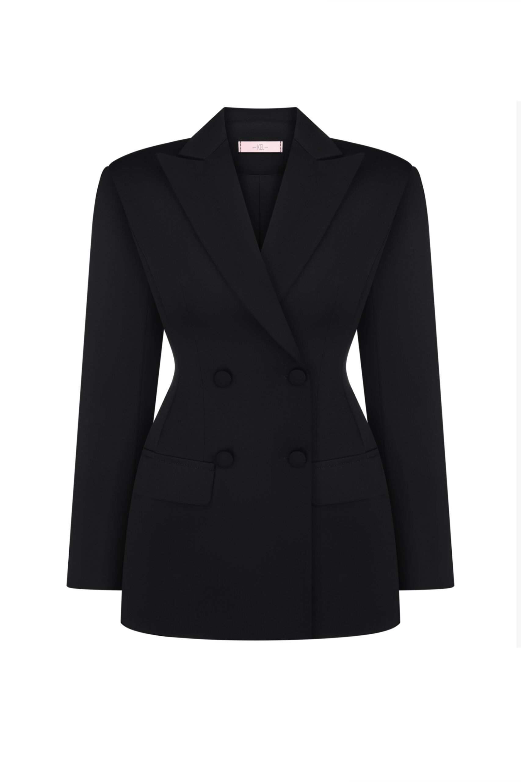 Жакет приталеного крою з довгими рукавами і відкладним коміром. Виконаний на двобортній застібці з чотирма ґудзиками в тон виробу. Декорований прорізними кишенями з клапанами, що додають стриманості та структури. Лаконічний силует підкреслює талію та створює витончений акцент на фігурі.