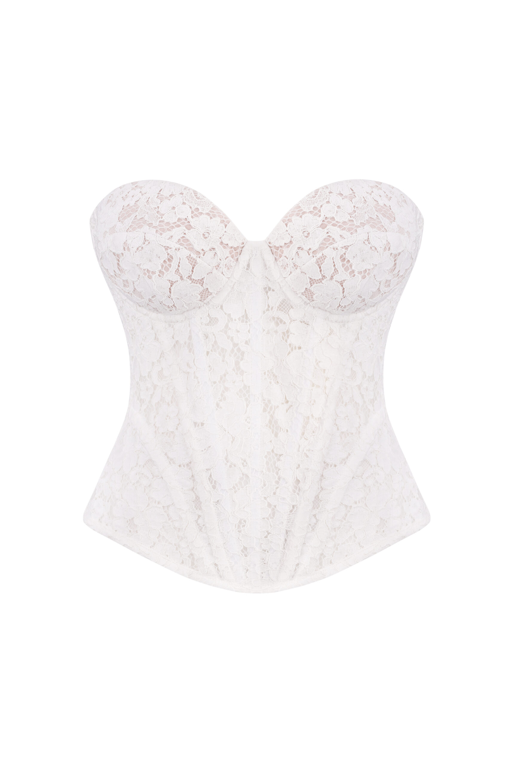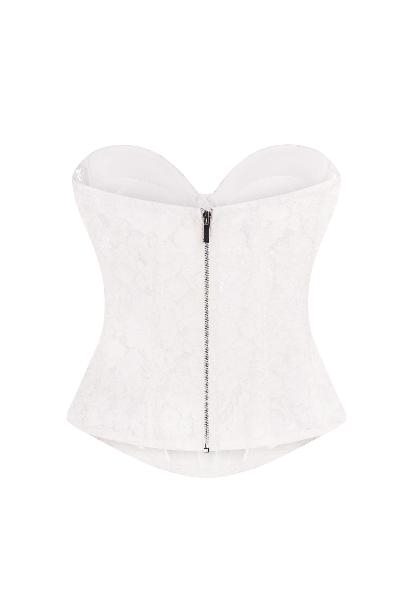 Корсет виконаний з білого мережива з квітковим візерунком. Гнучкі металеві кісточки забезпечують ідеальну посадку, а блискавка на спині робить виріб зручним у застібанні.