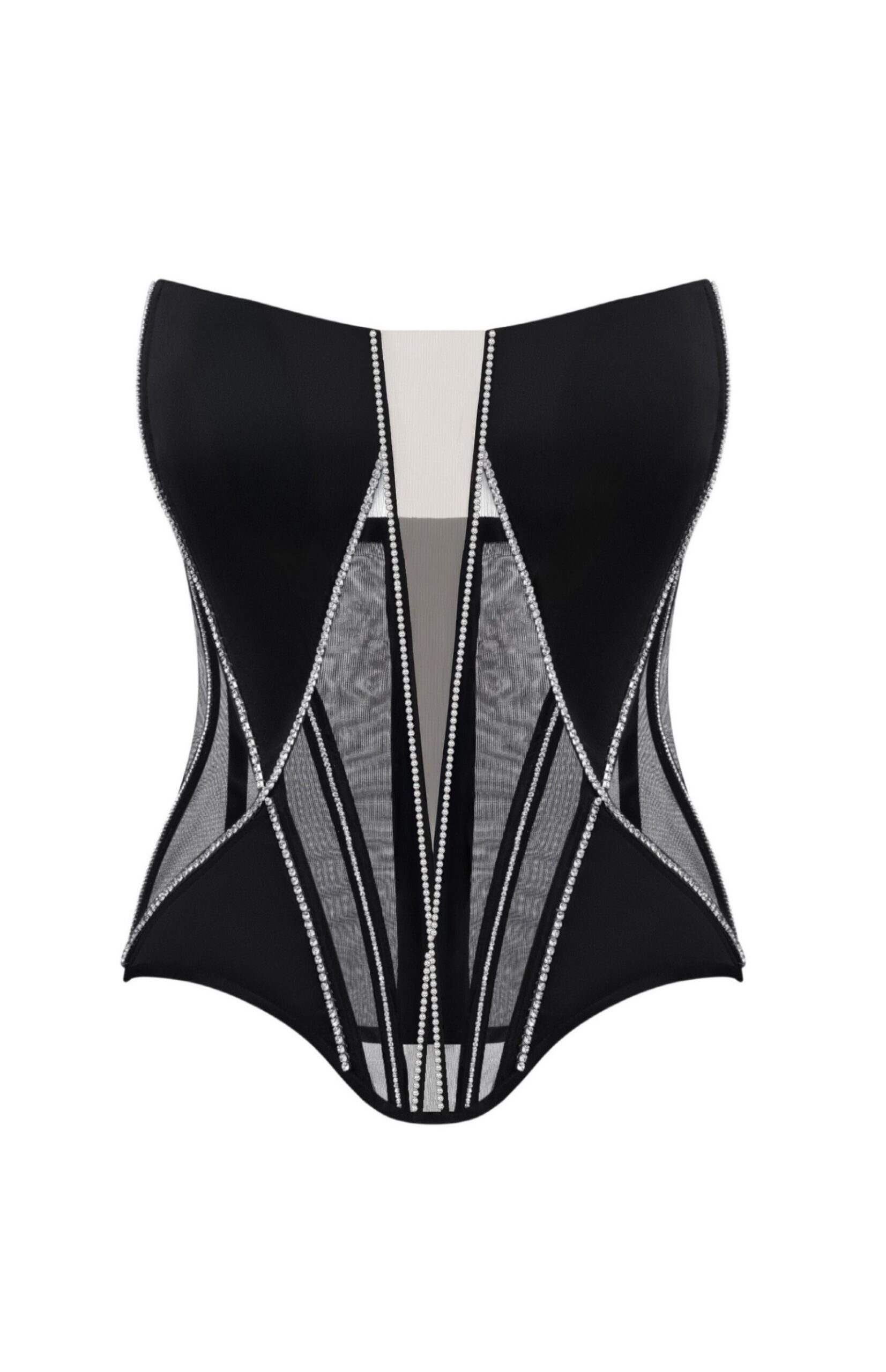 Корсет “Мадлен” — втілення елегантності та сміливості. Поєднання прозорих вставок, глибокого декольте і мерехтливого декору з каміння створює спокусливий силует, підкреслюючи талію та додаючи образу розкоші. Ідеальний вибір для особливих моментів.
