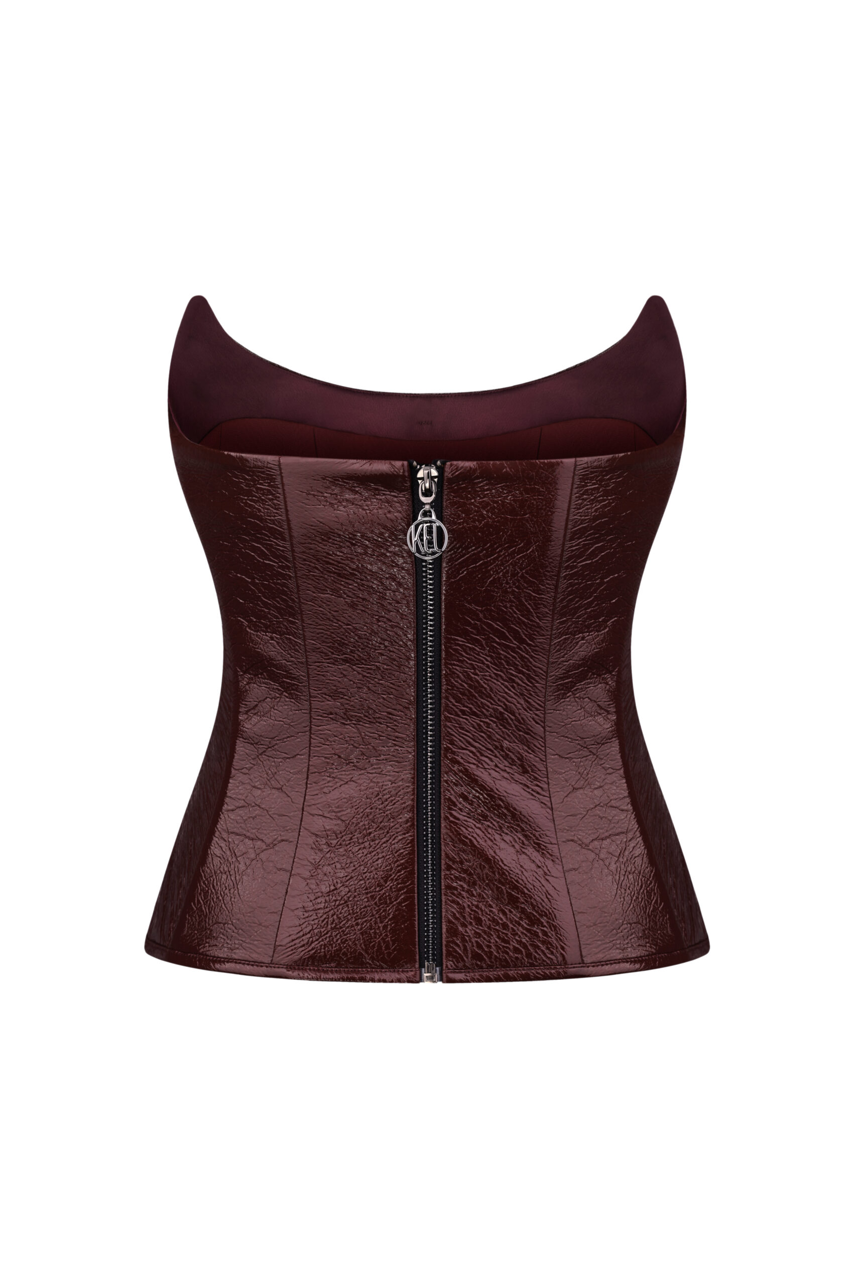Елегантний корсет глибокого бордового кольору виконаний з матеріалу з глянсовим покриттям. Асиметричні драпірування додають текстурності та підкреслюють лінію талії, створюючи витончений силует. Відкритий верх з м’яко окресленим вирізом ідеально доповнює образ, надаючи йому жіночності та елегантності. Підходить для вечірніх виходів чи стильних заходів.