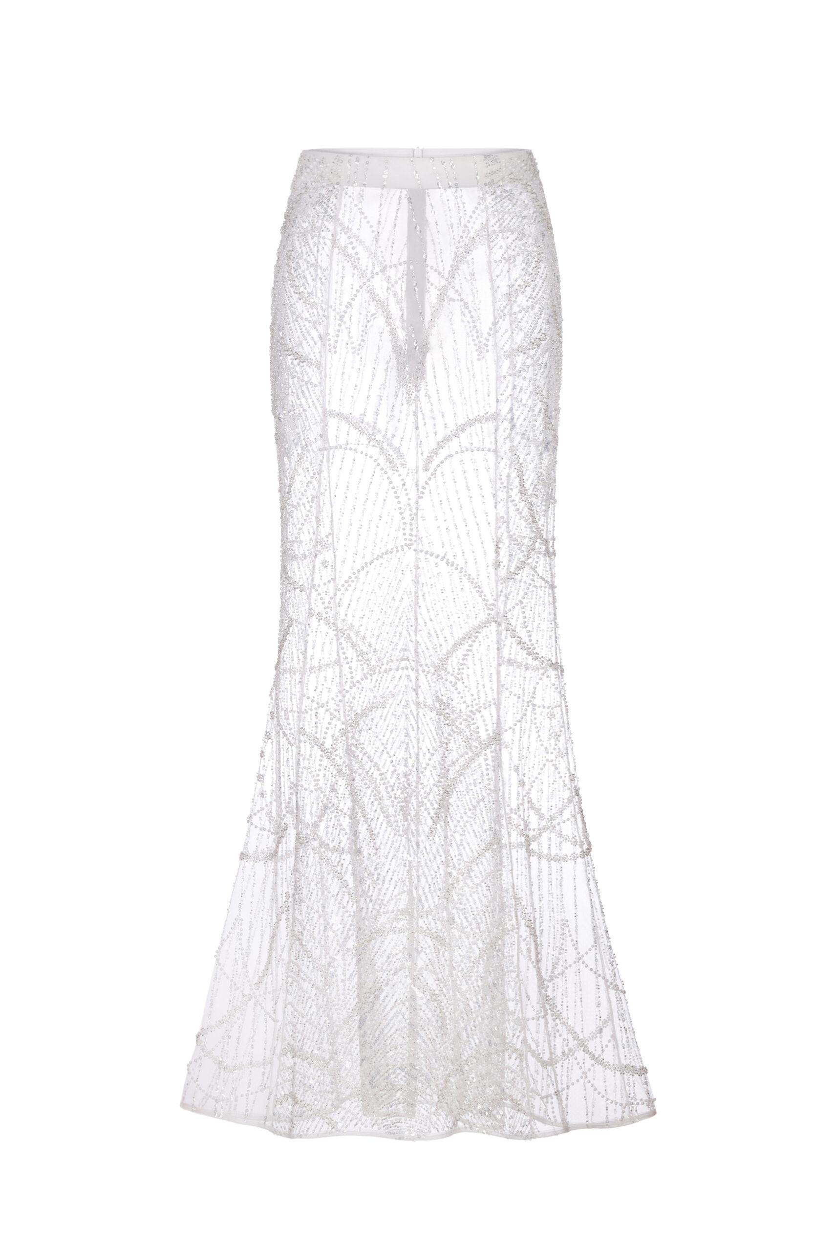 Вишукана прозора спідниця з делікатної тканини, декорованої блискучим бісером. Модель має легке розкльошення донизу, що створює ніжний та ефектний силует під час руху. Спідниця додає образу святковості та розкоші, ідеально поєднується з лаконічним корсетом або жакетом. Прекрасний вибір для вечірніх виходів або особливих подій.