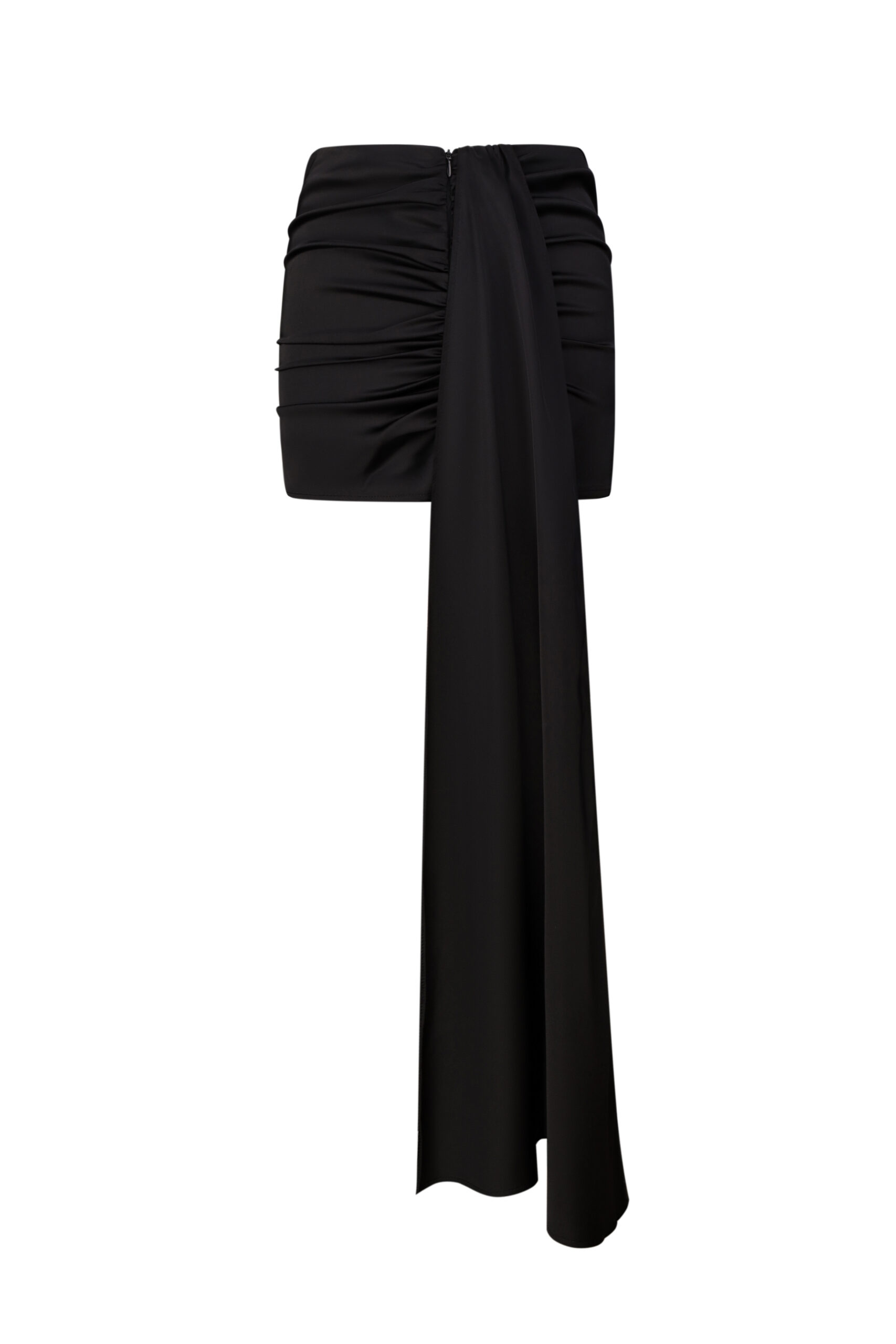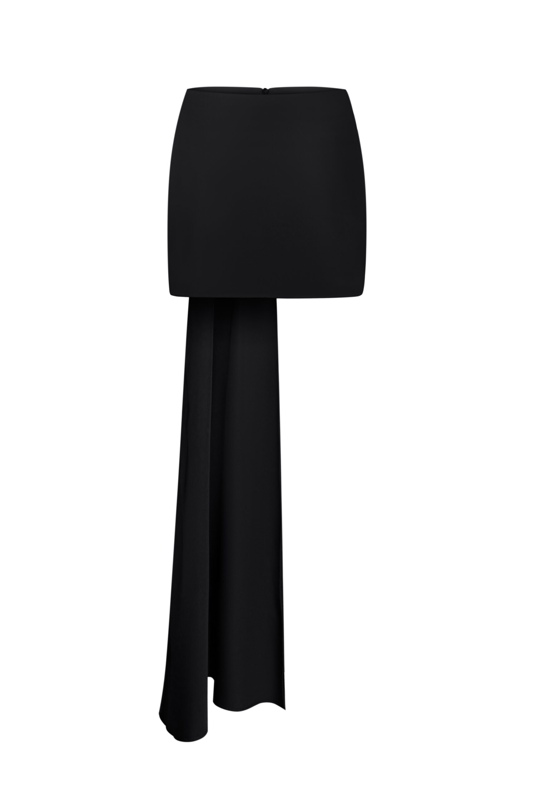 Чорна міні-спідниця з довгим шлейфом – це стильне поєднання елегантності та сміливості. Мінімалістична передня частина контрастує з вільним шлейфом, що додає динамічності образу. Ідеальний вибір для урочистих заходів або вечірніх виходів.