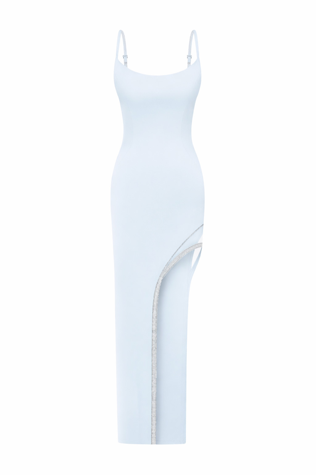 Елегантна довга сукня облягаючого силуету, виконана з плотної костюмної тканини. Родзинкою дизайну є високий асиметричний розріз на стегні, прикрашений сріблястою окантовкою з кристалами, що додає образу розкішного акценту. Тонкі бретелі підкреслюють витонченість і створюють ідеальний варіант для вечірніх виходів.