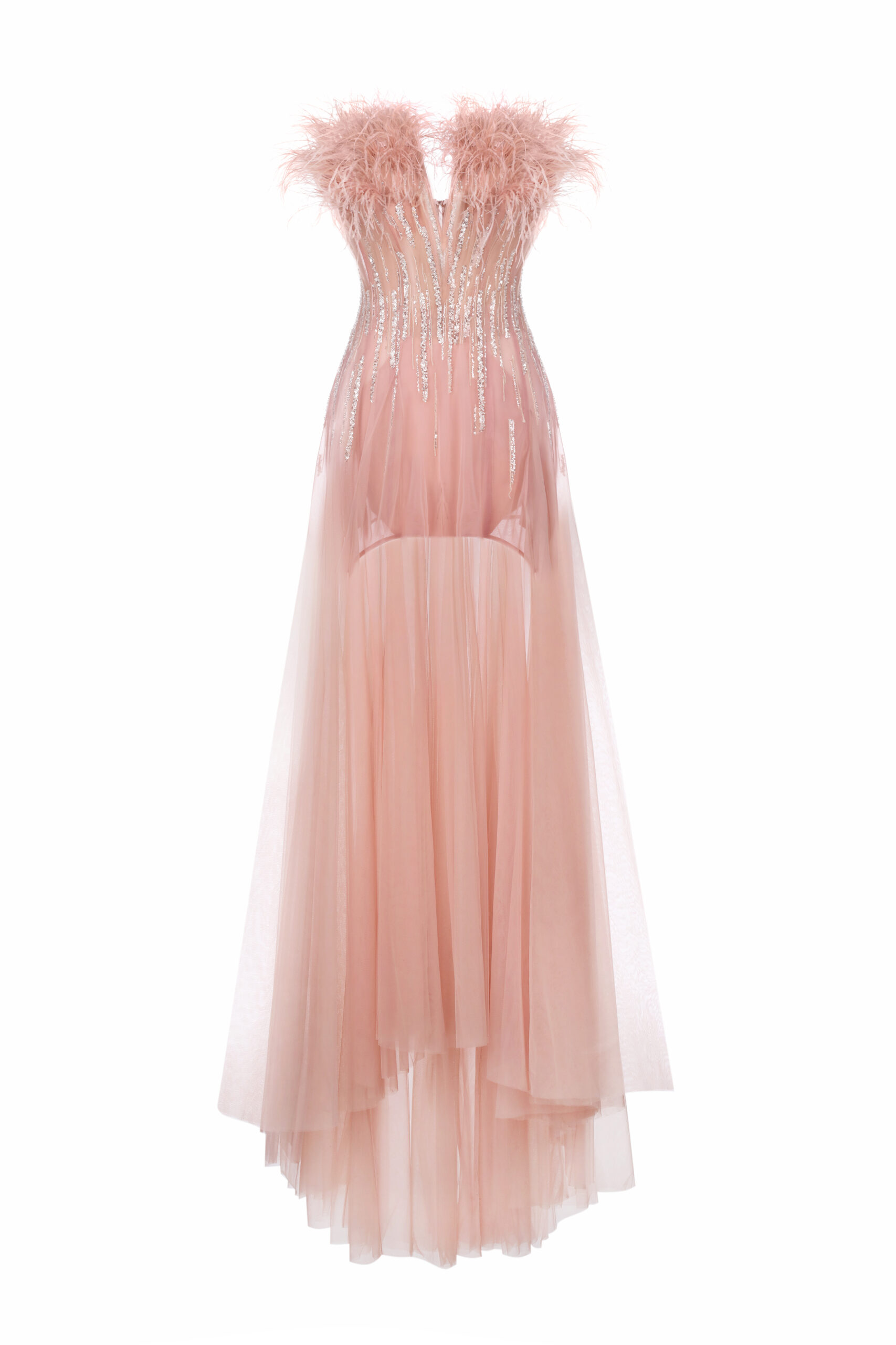Вечірнє плаття з прозорої сітки з корсетним верхом. Ліф оздоблений вертикальними візерунками з паєток і делікатним пір’ям по лінії декольте. Спідниця виконана з багатошарового фатину, що створює легку прозорість і асиметричний поділ. Модель підкреслює силует і поєднує розкіш з сучасною виразністю.