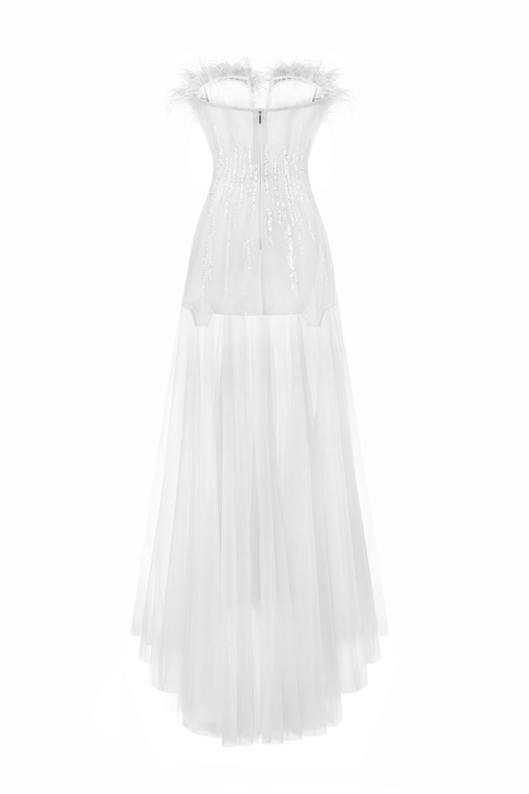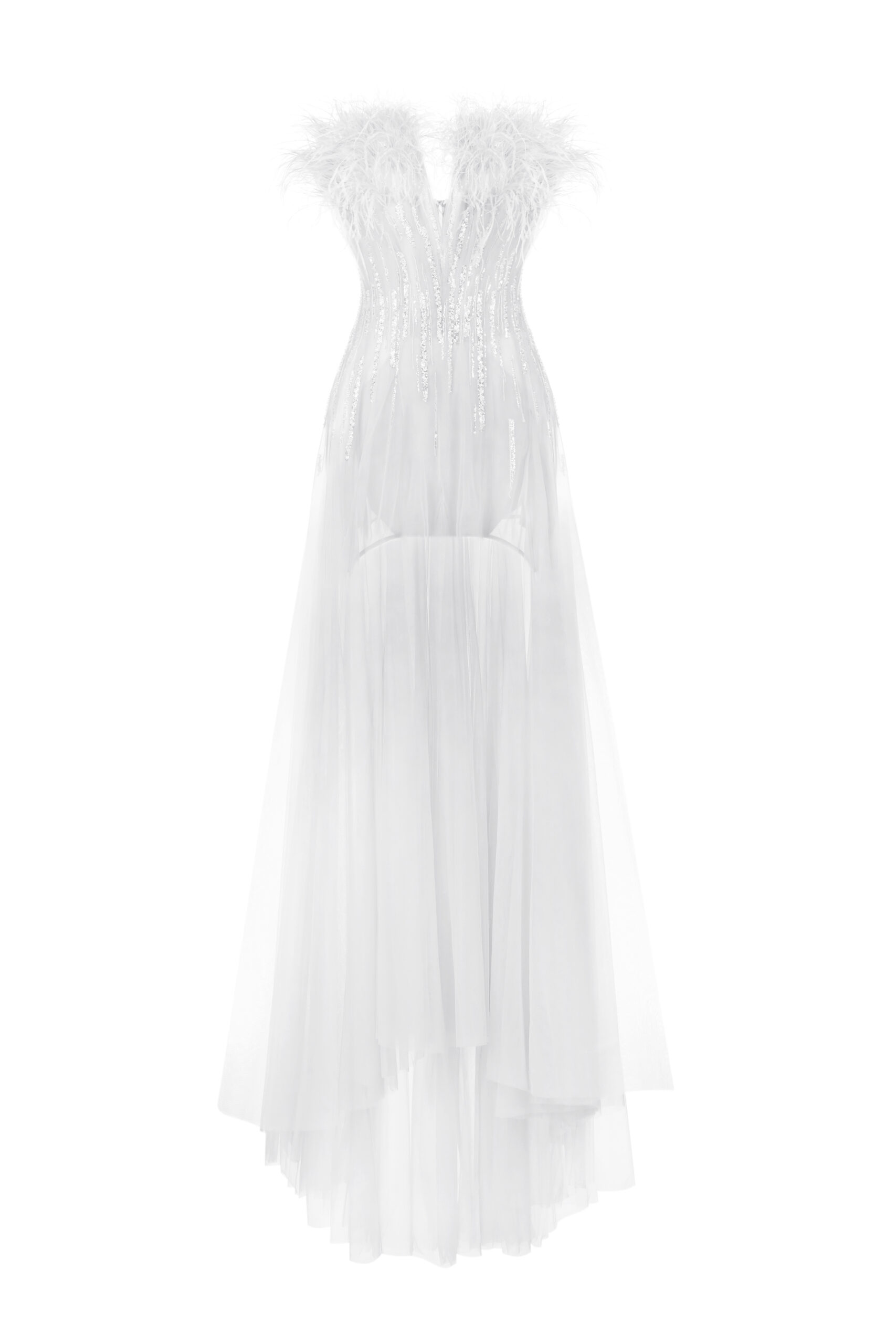 Вечірнє плаття з прозорої сітки з корсетним верхом. Ліф оздоблений вертикальними візерунками з паєток і делікатним пір’ям по лінії декольте. Спідниця виконана з багатошарового фатину, що створює легку прозорість і асиметричний поділ. Модель підкреслює силует і поєднує розкіш з сучасною виразністю.
