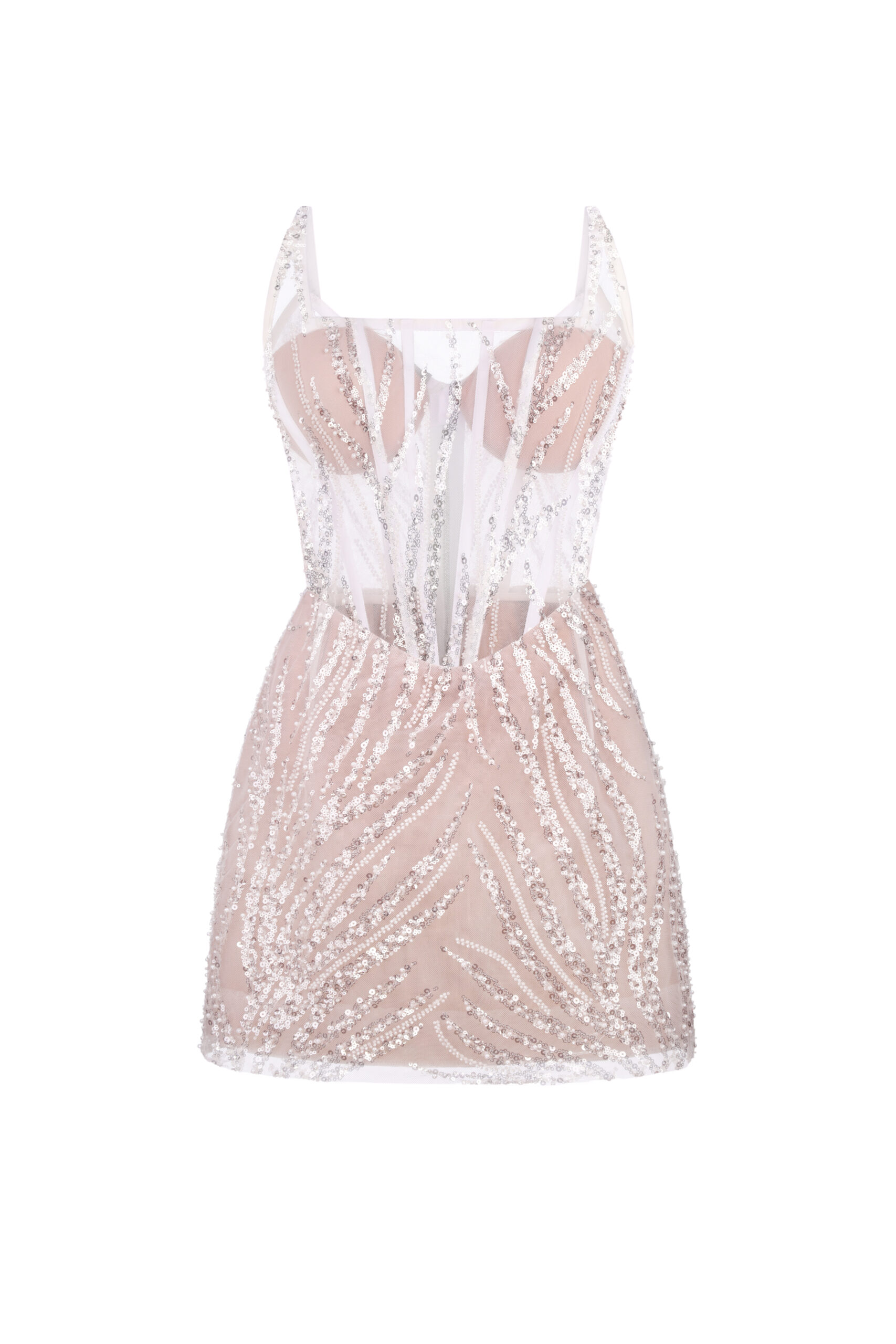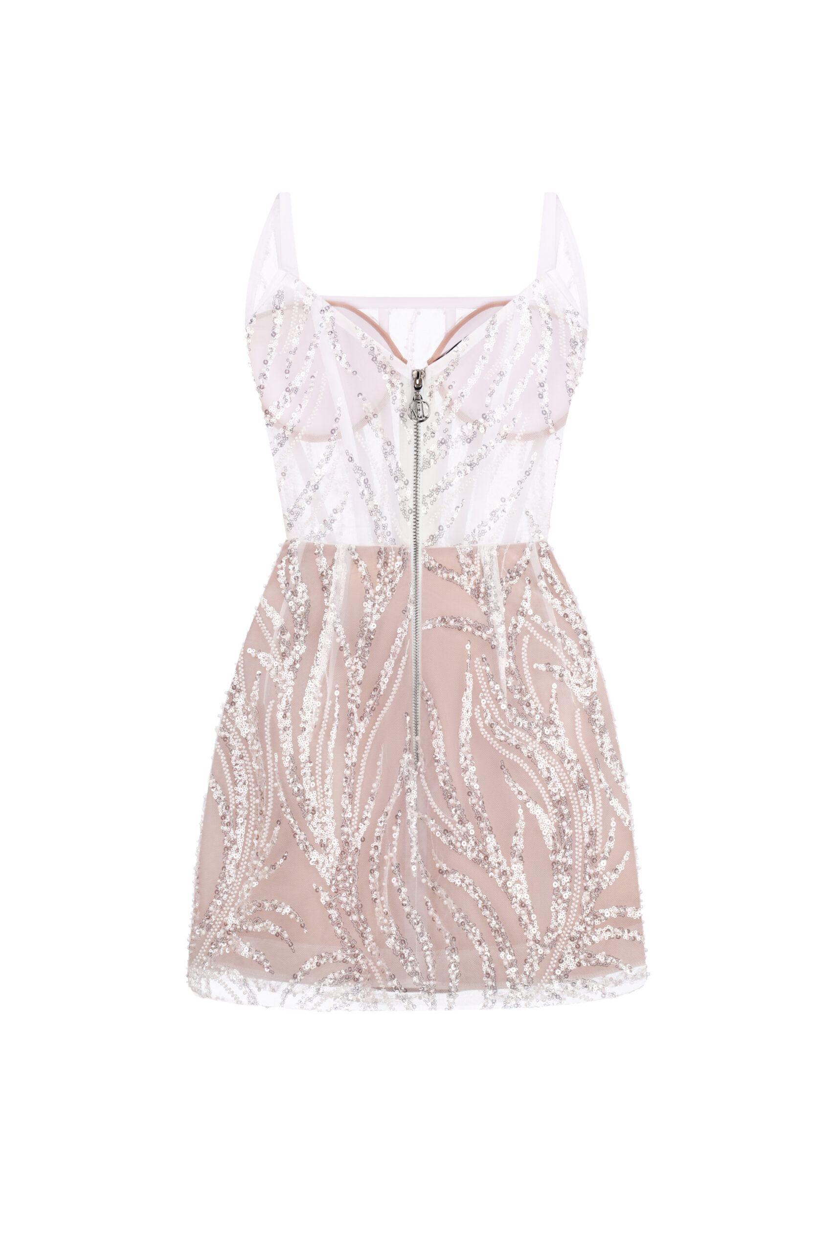 Ефектна міні-сукня з прозорої сітки з фігурними вставками та блискучою вишивкою пайєтками, що створює ілюзію глибини та об’ємності. Чорний орнамент додає драматизму, водночас підкреслюючи силует. Ідеальний вибір для вечірки, червоної доріжки або гучного виходу.