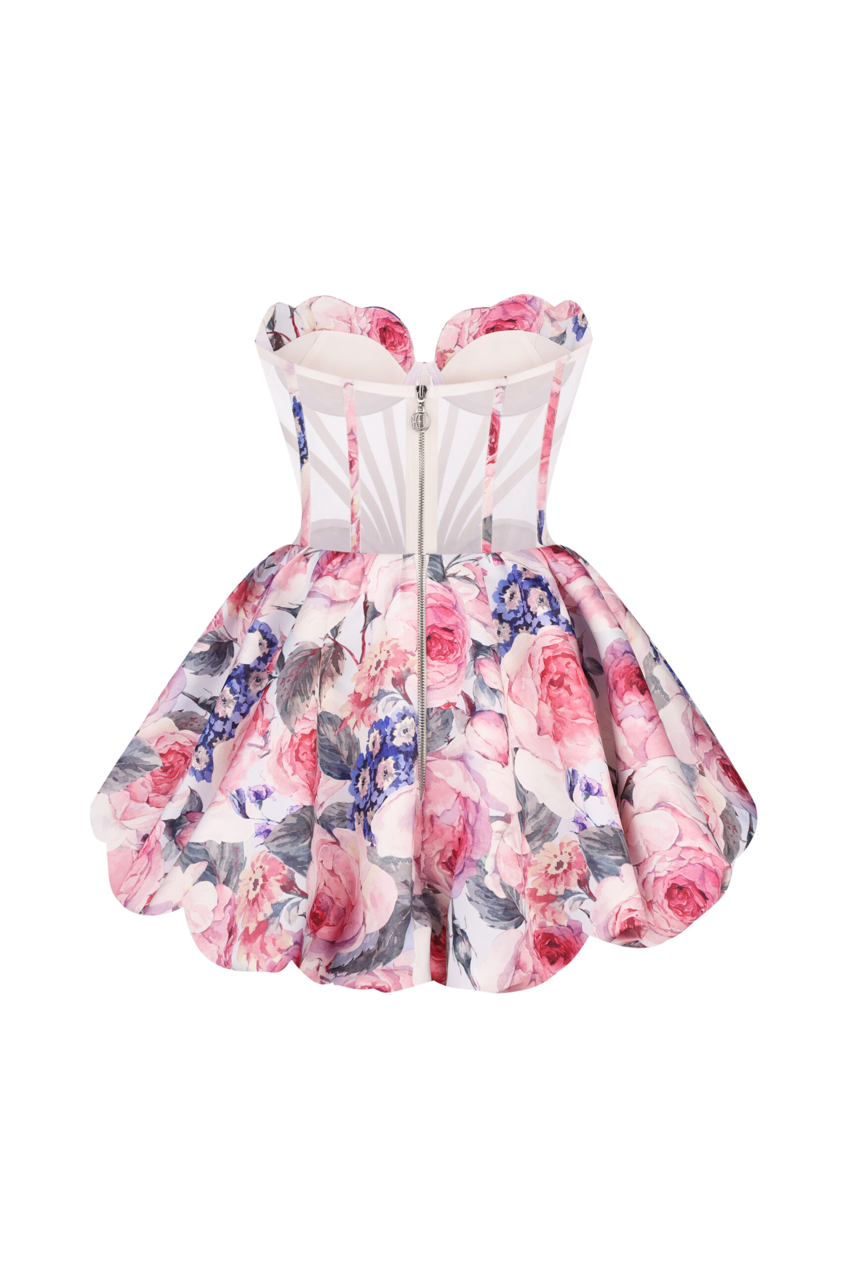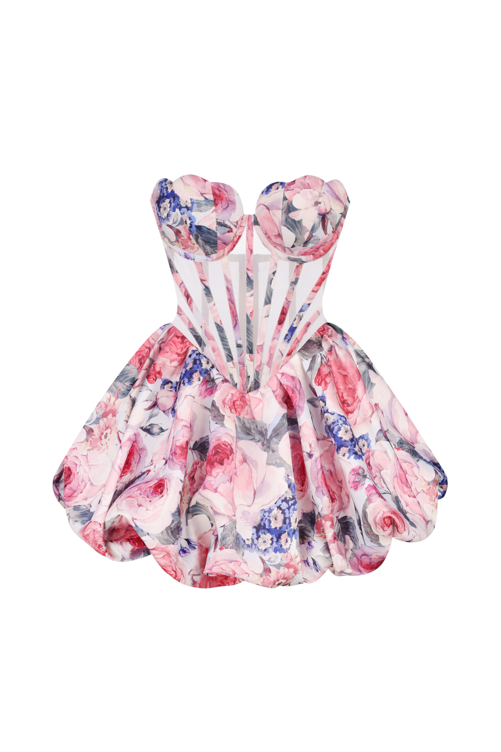 Ефектна міні-сукня з корсетним ліфом і виразними кісточками, що підкреслюють талію. Виконана з щільної тканини з квітковим принтом у рожево-лавандовій гамі. Пишна спідниця з об’ємними складками надає образу жіночності й романтики. Ідеальний вибір для особливих літніх подій та яскравих фотосесій.