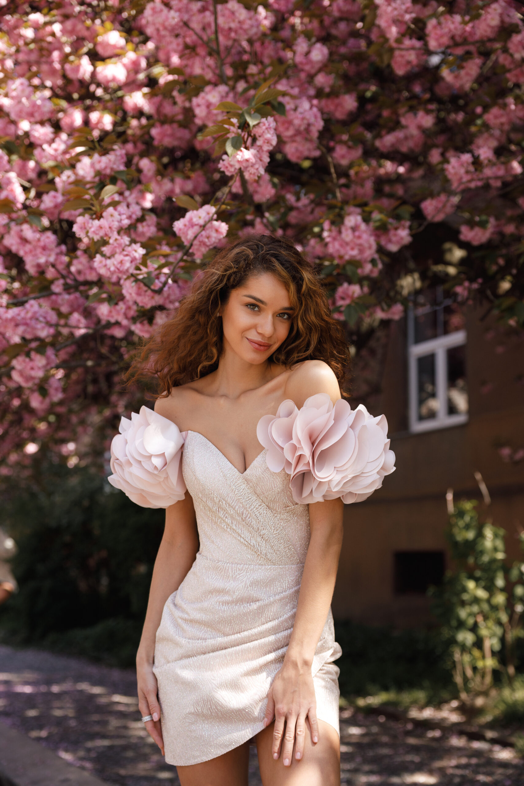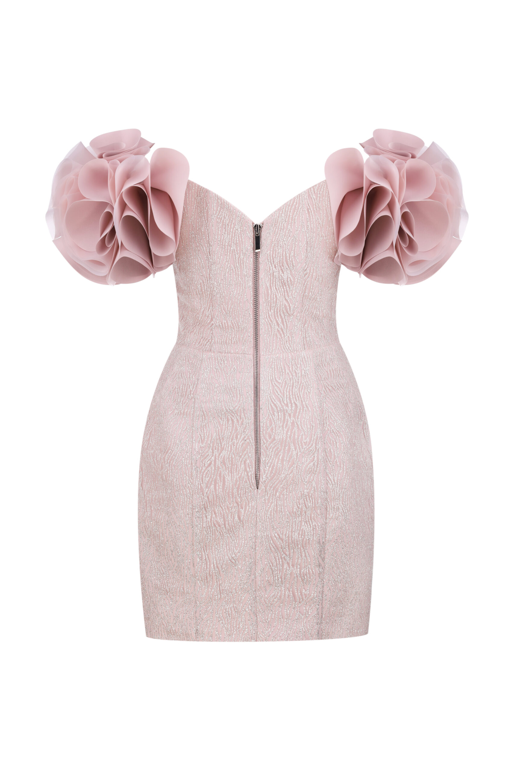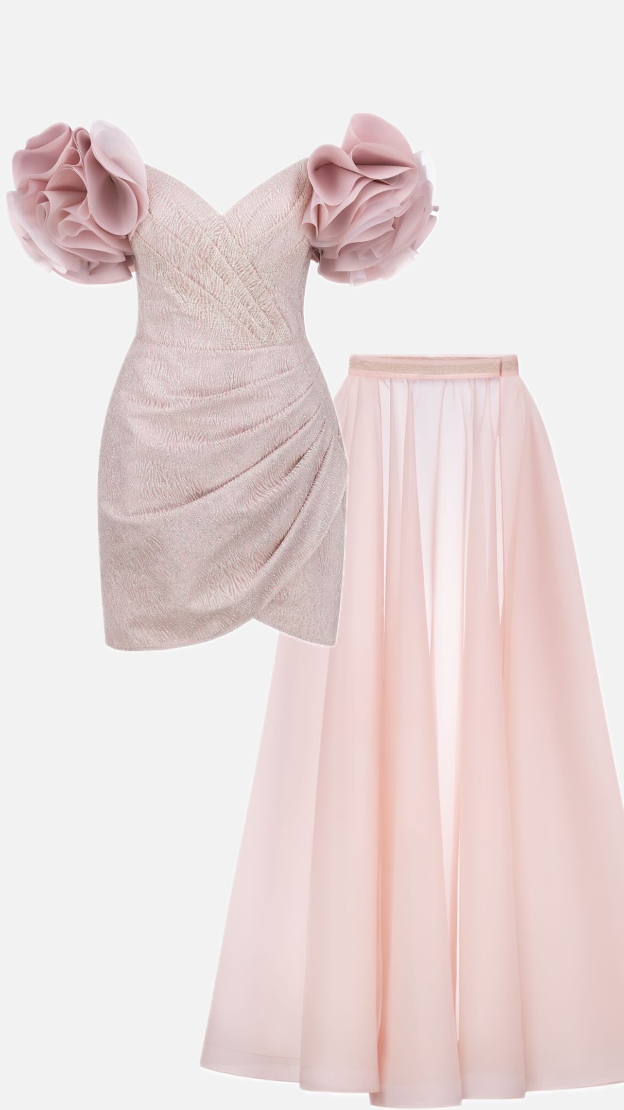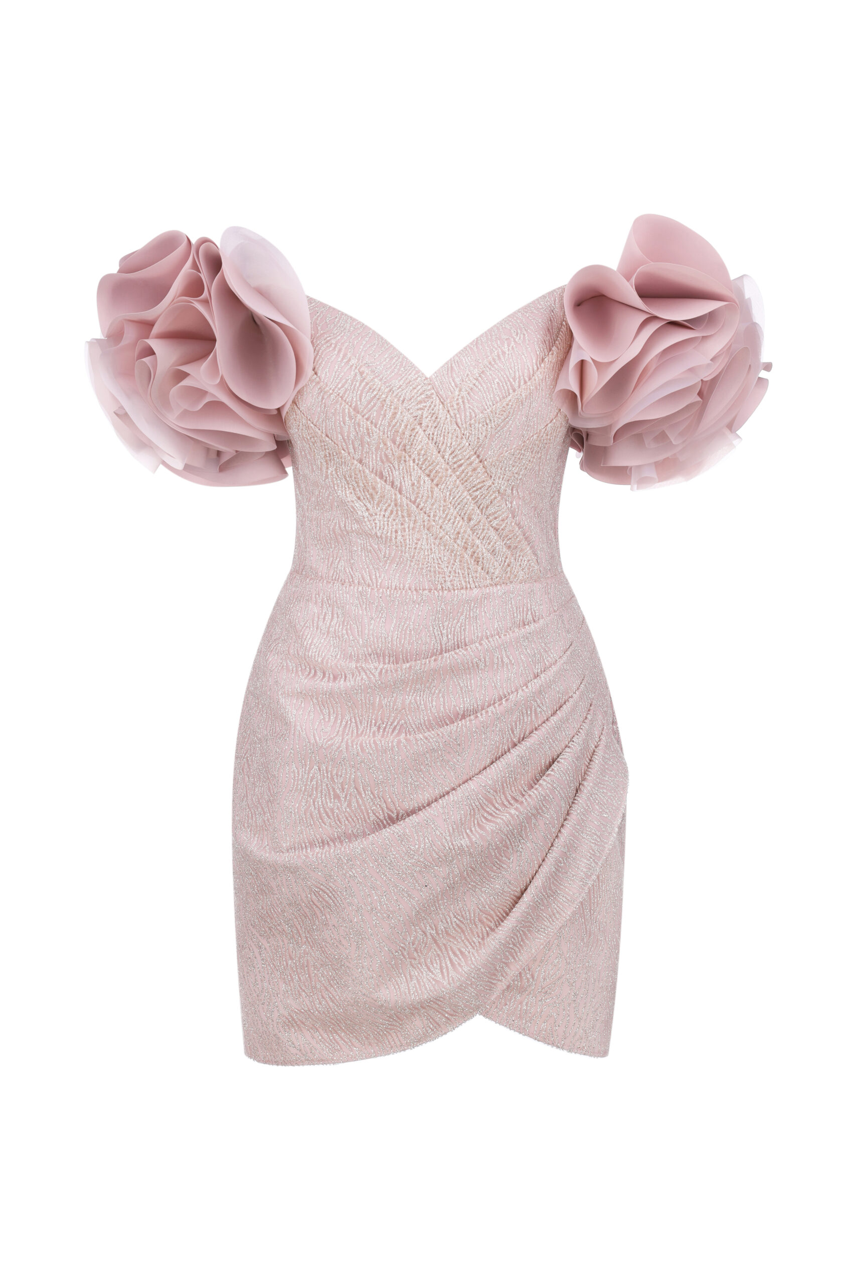 Елегантна коктейльна сукня м’якого рожевого відтінку створена для витончених образів. Фігурний корсет із драпіруванням підкреслює силует, а пишні об’ємні рукави додають вишуканої романтики. Тканина з легким мерехтінням надає сукні святкового шарму. Ідеальний вибір для вечірок, урочистих заходів або особливих подій.