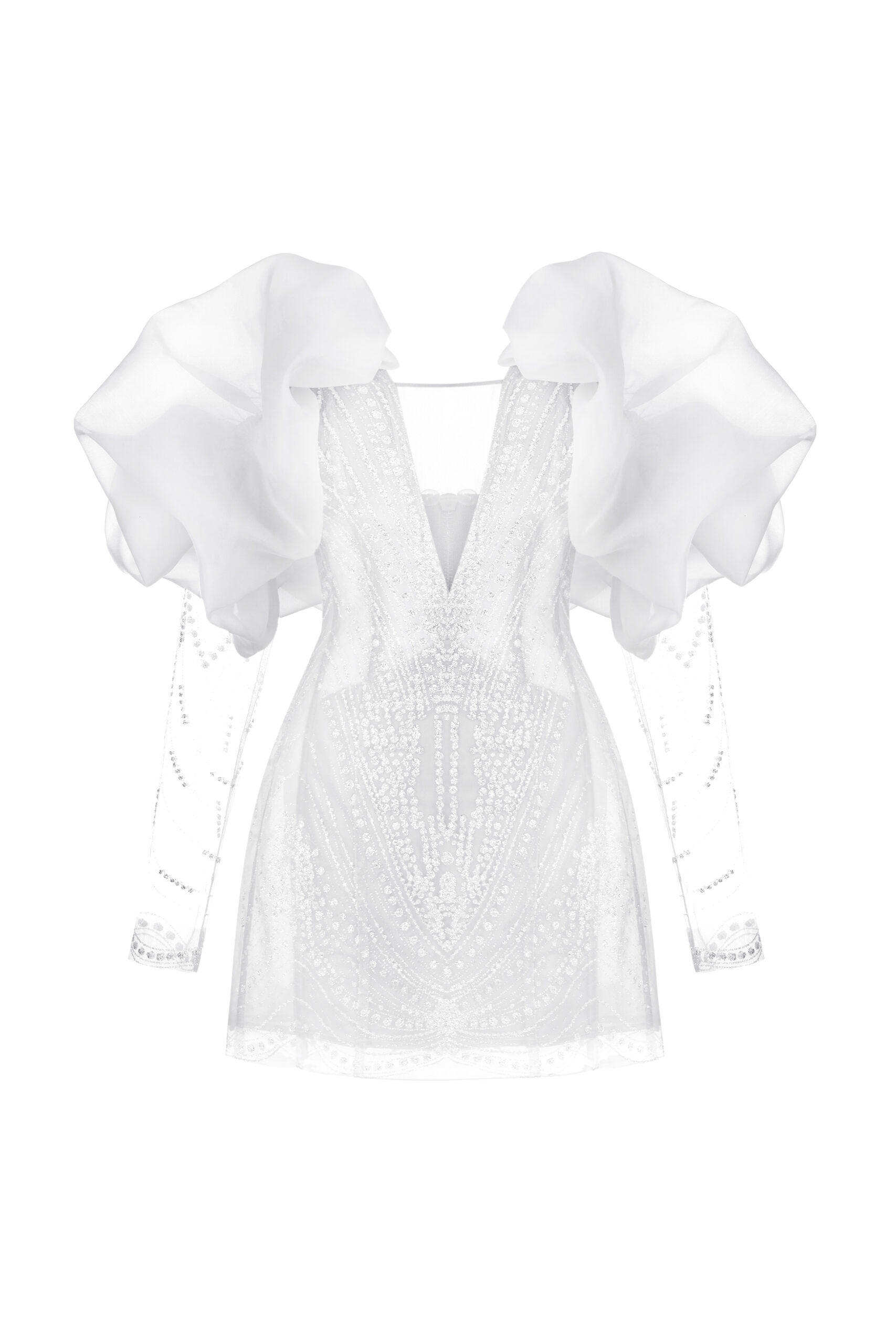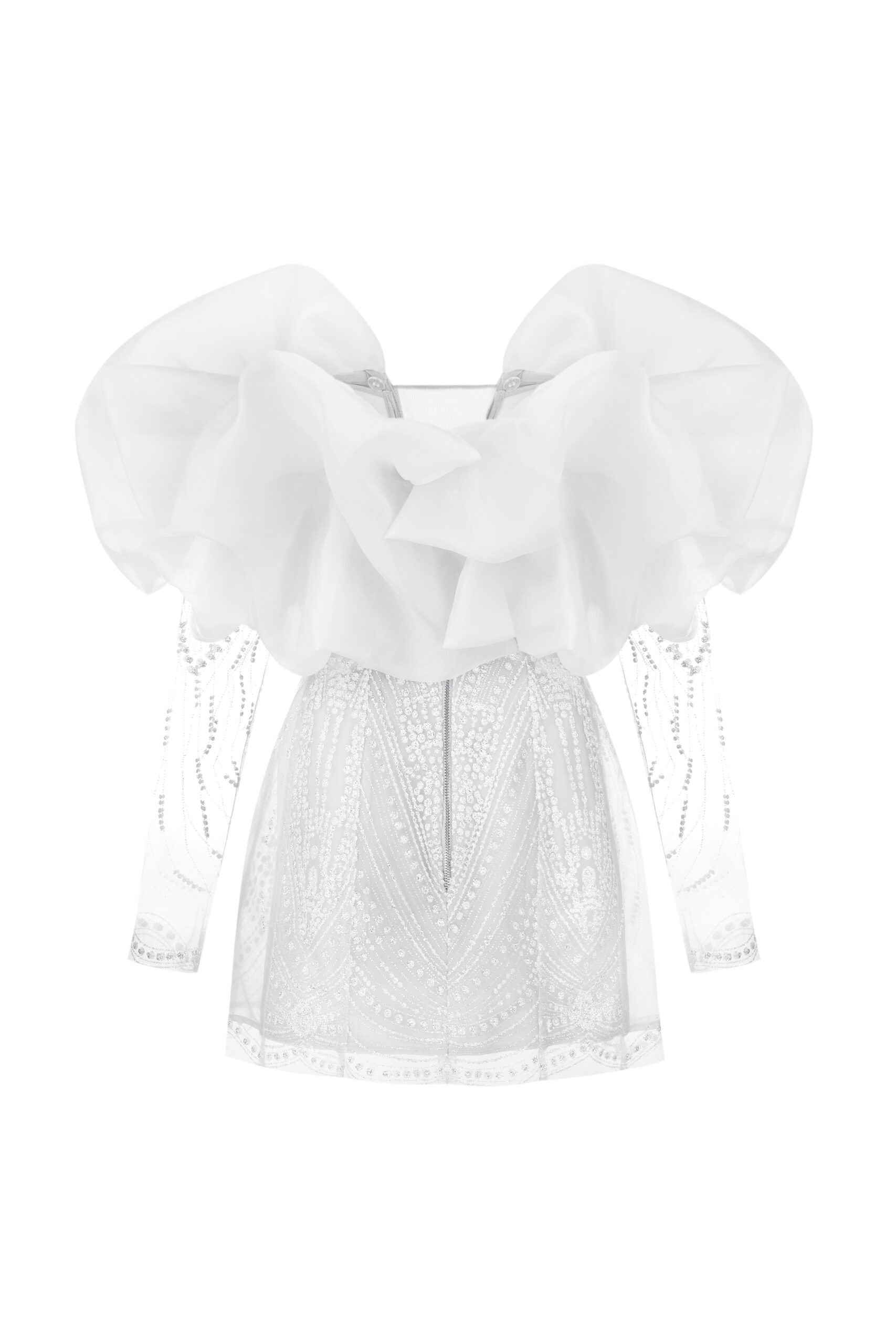 Сукня-трансформер з напівпрозорої тканини із візерунками гліттеру. Ліф з глибоким вирізом декольте та об’ємними рукавами. Має зʼємні рукави, які фіксуються на ґудзики. На спинці металева блискавка.