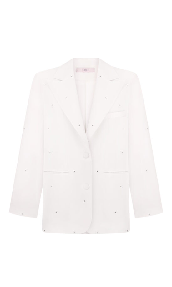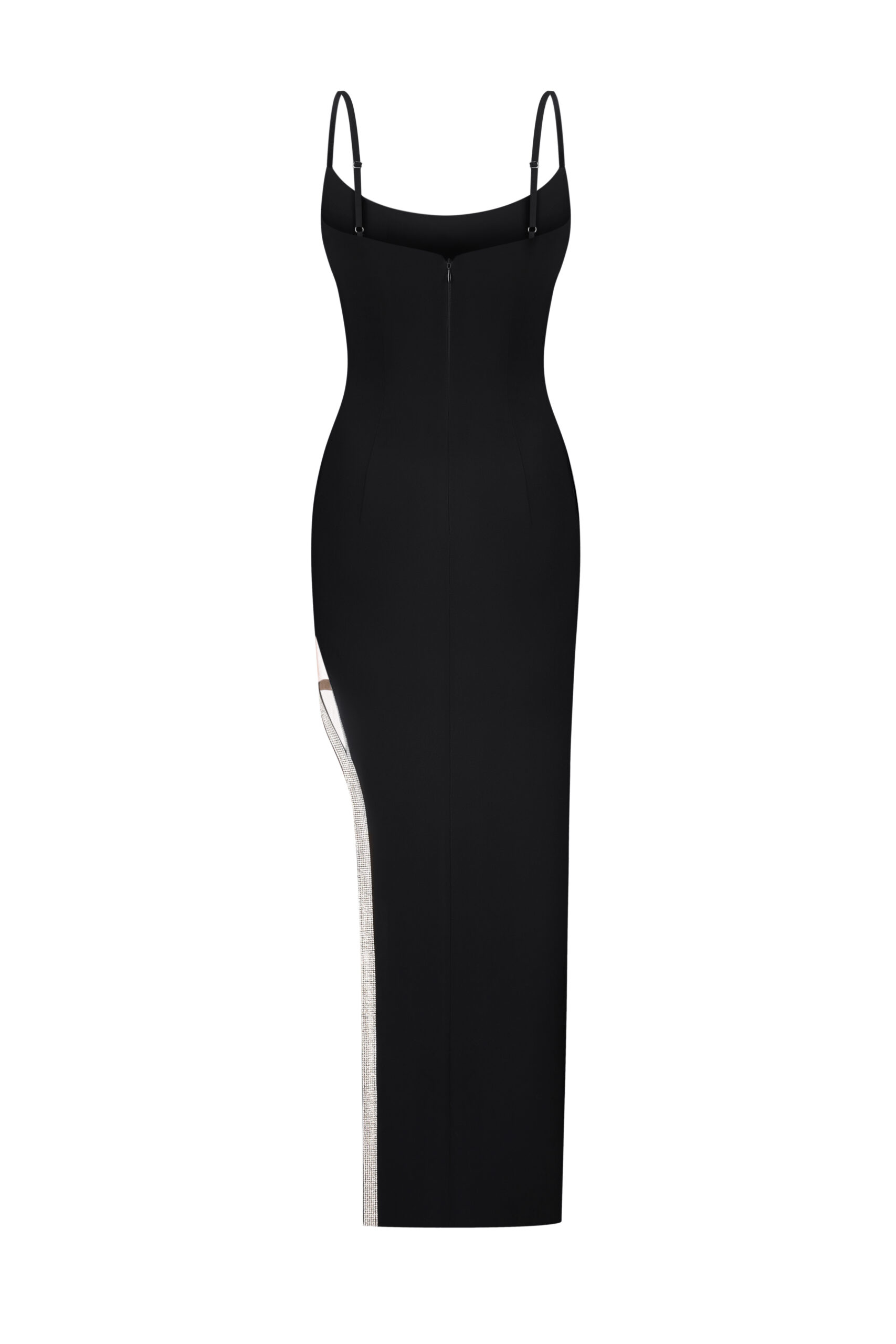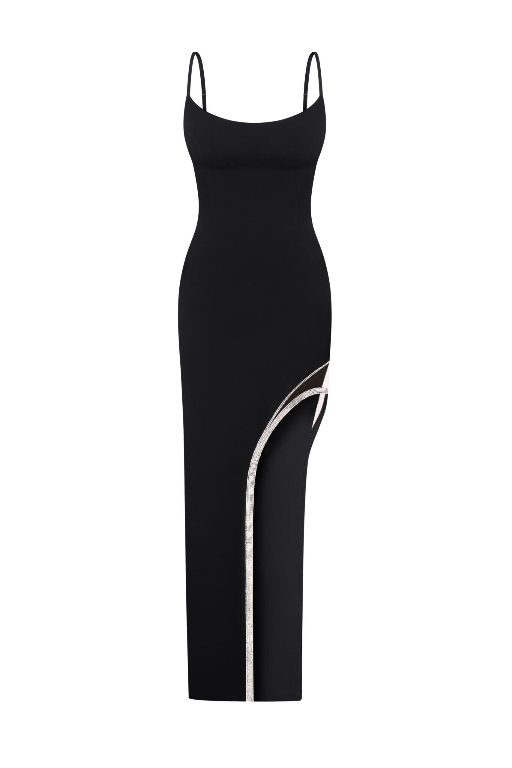Елегантна довга сукня облягаючого силуету, виконана з плотної костюної тканини. Родзинкою дизайну є високий асиметричний розріз на стегні, прикрашений сріблястою окантовкою з кристалами, що додає образу розкішного акценту. Тонкі бретелі підкреслюють витонченість і створюють ідеальний варіант для вечірніх виходів.
