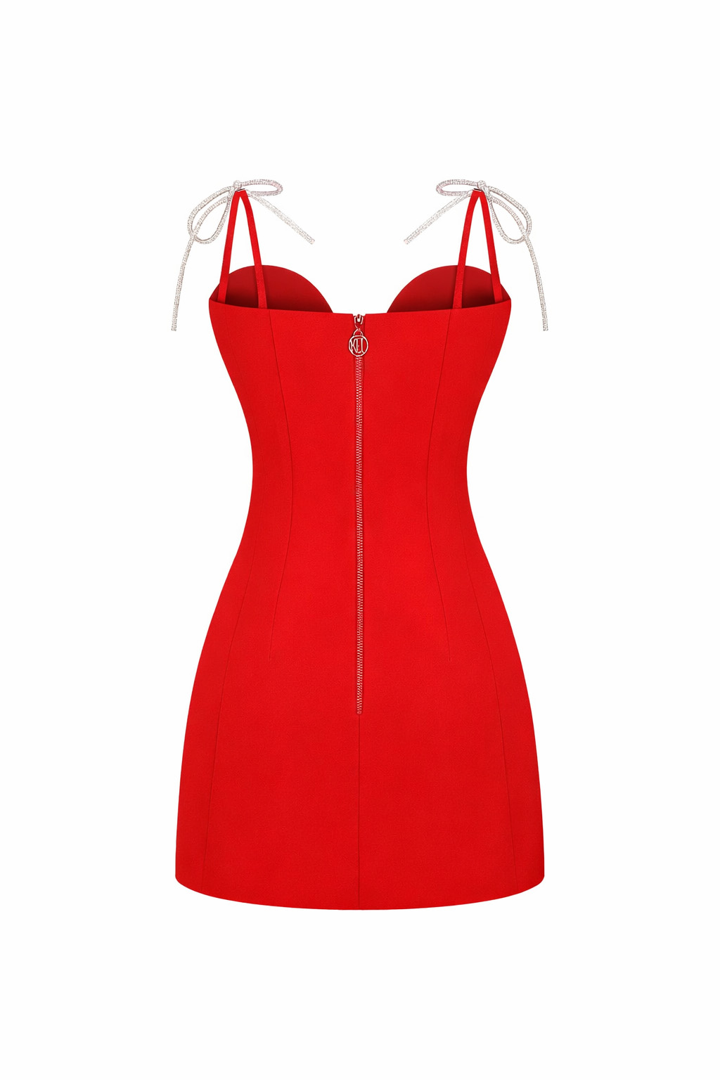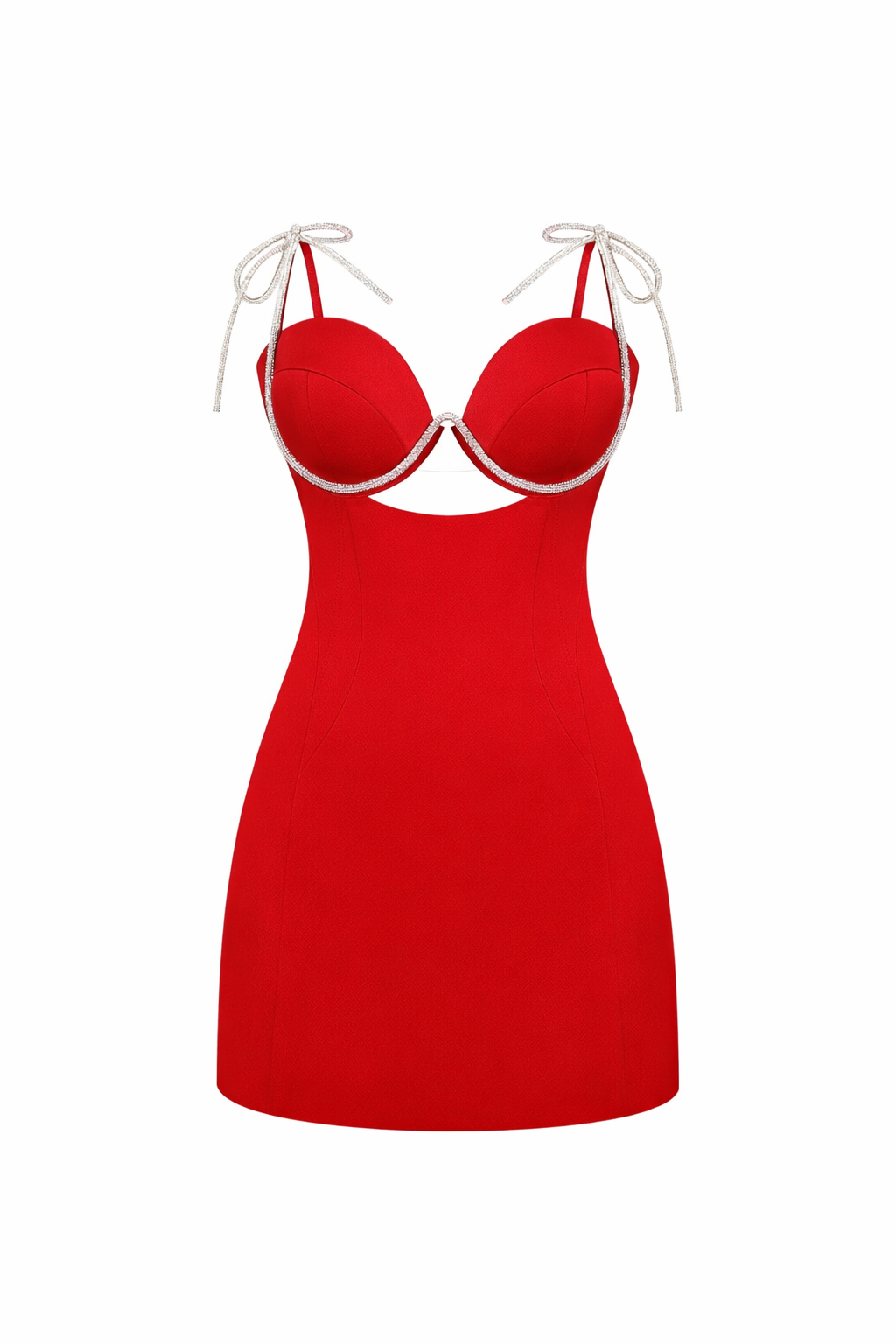 Чорвона міні сукня витонченого облягаючого силуету, доповнена підкресленими чашками на кісточках, декорованими блискучим жгутом зі стразами. Регульовані сріблясті зав’язки на плечах додають елегантності, а сміливий виріз під бюстом створює стильний і сучасний акцент. Ідеальний вибір для вечірнього заходу.