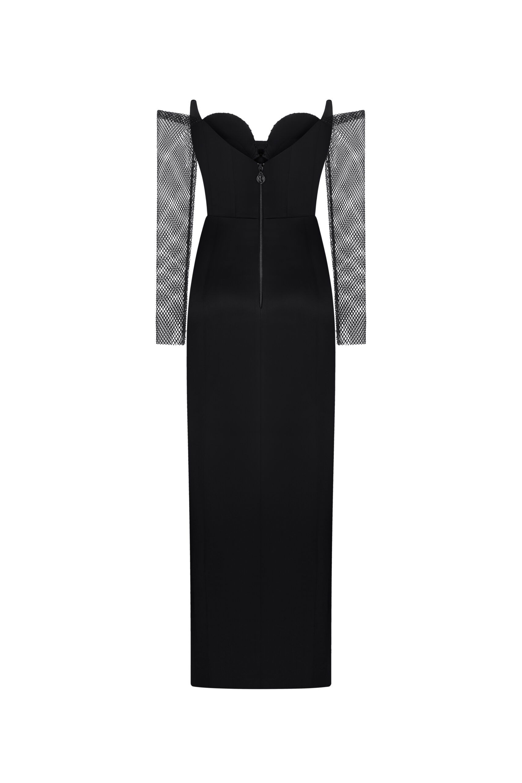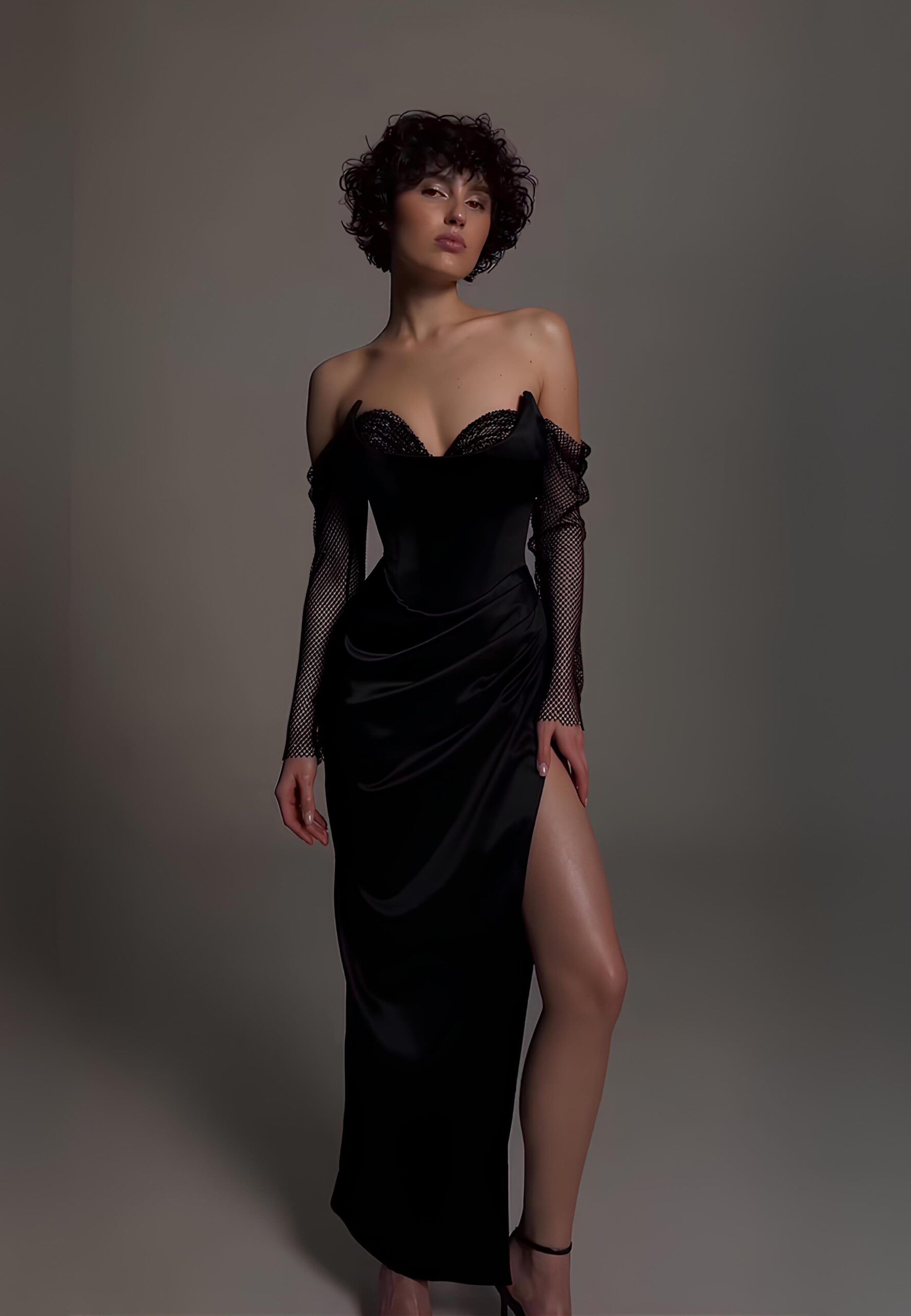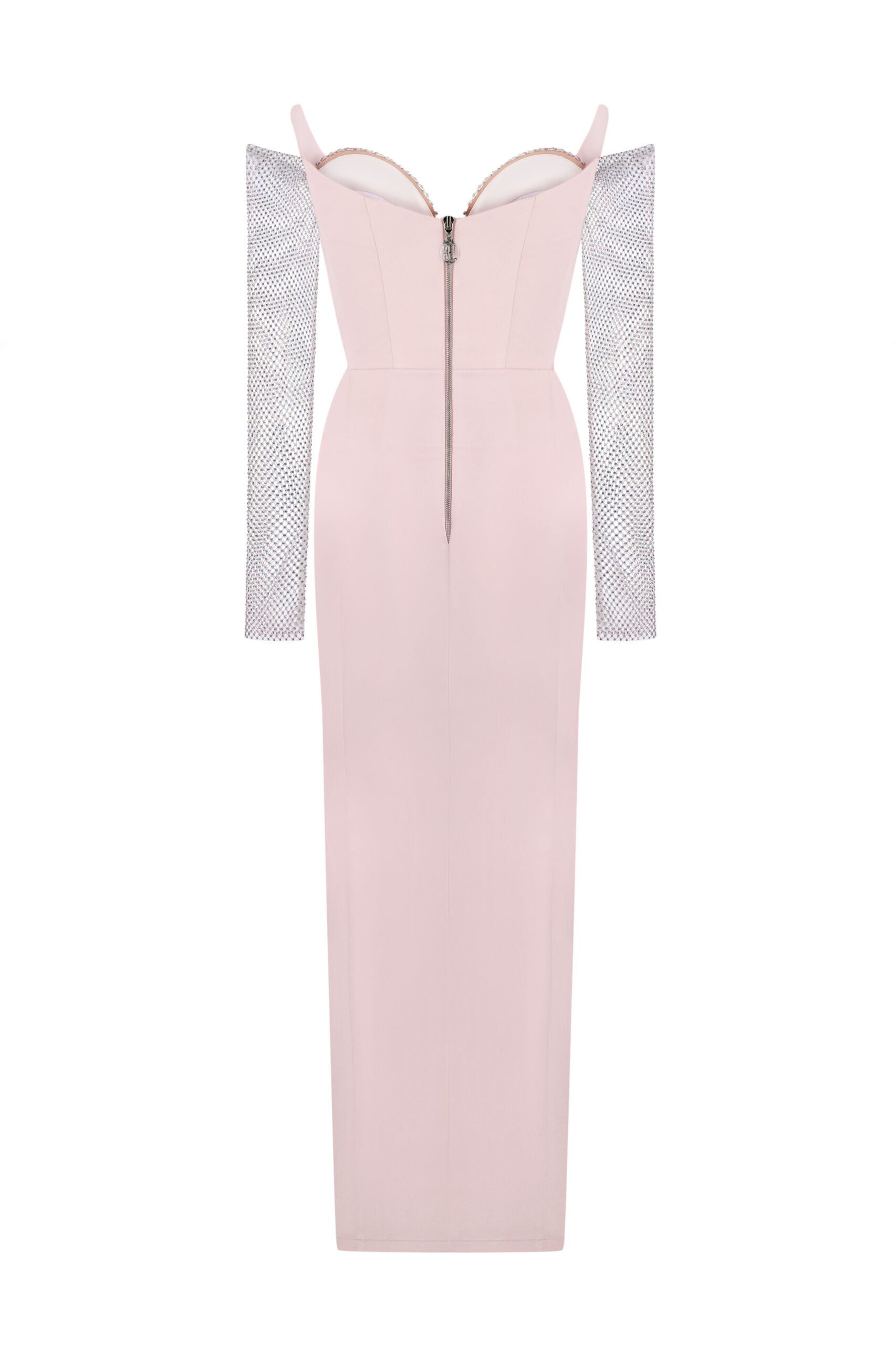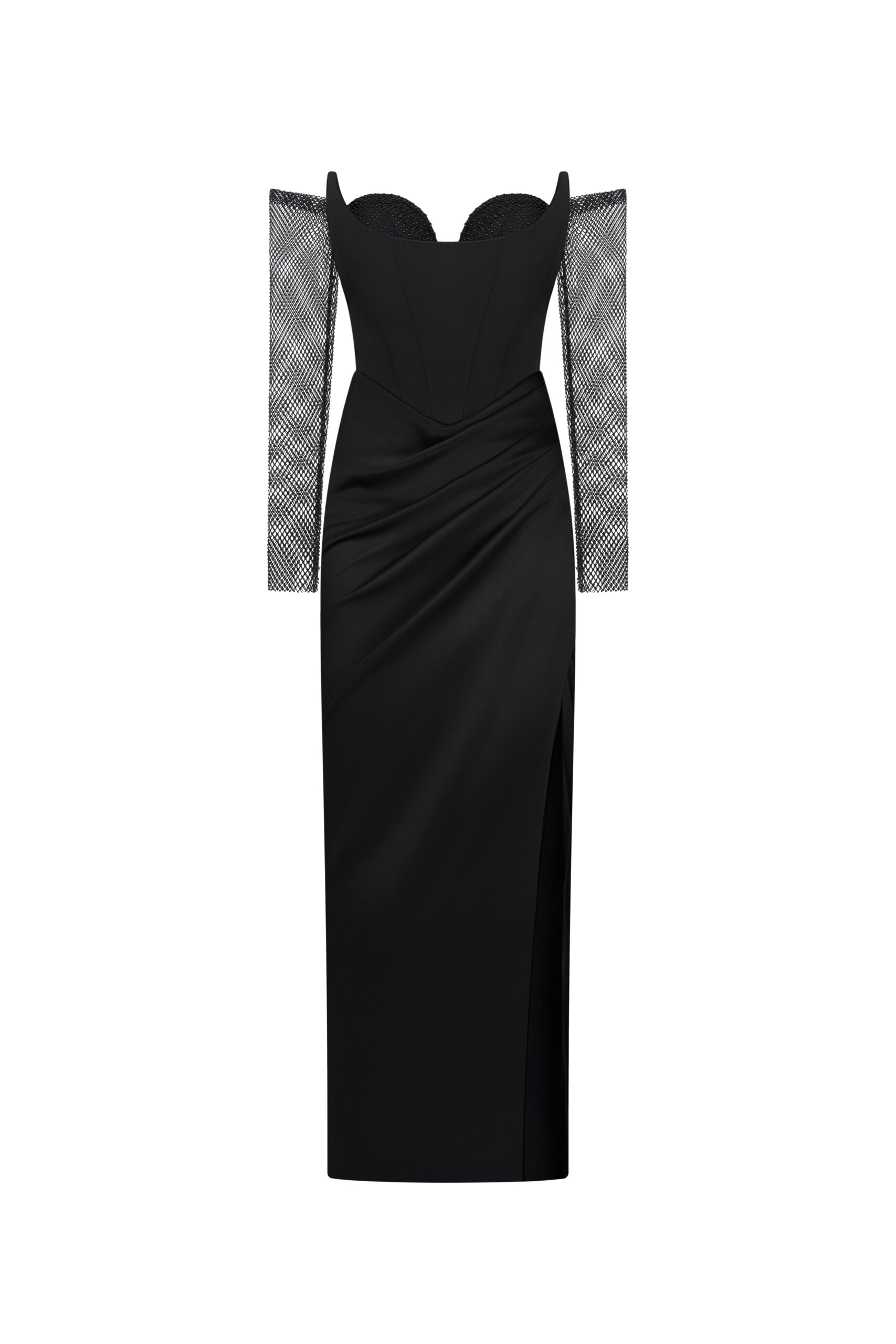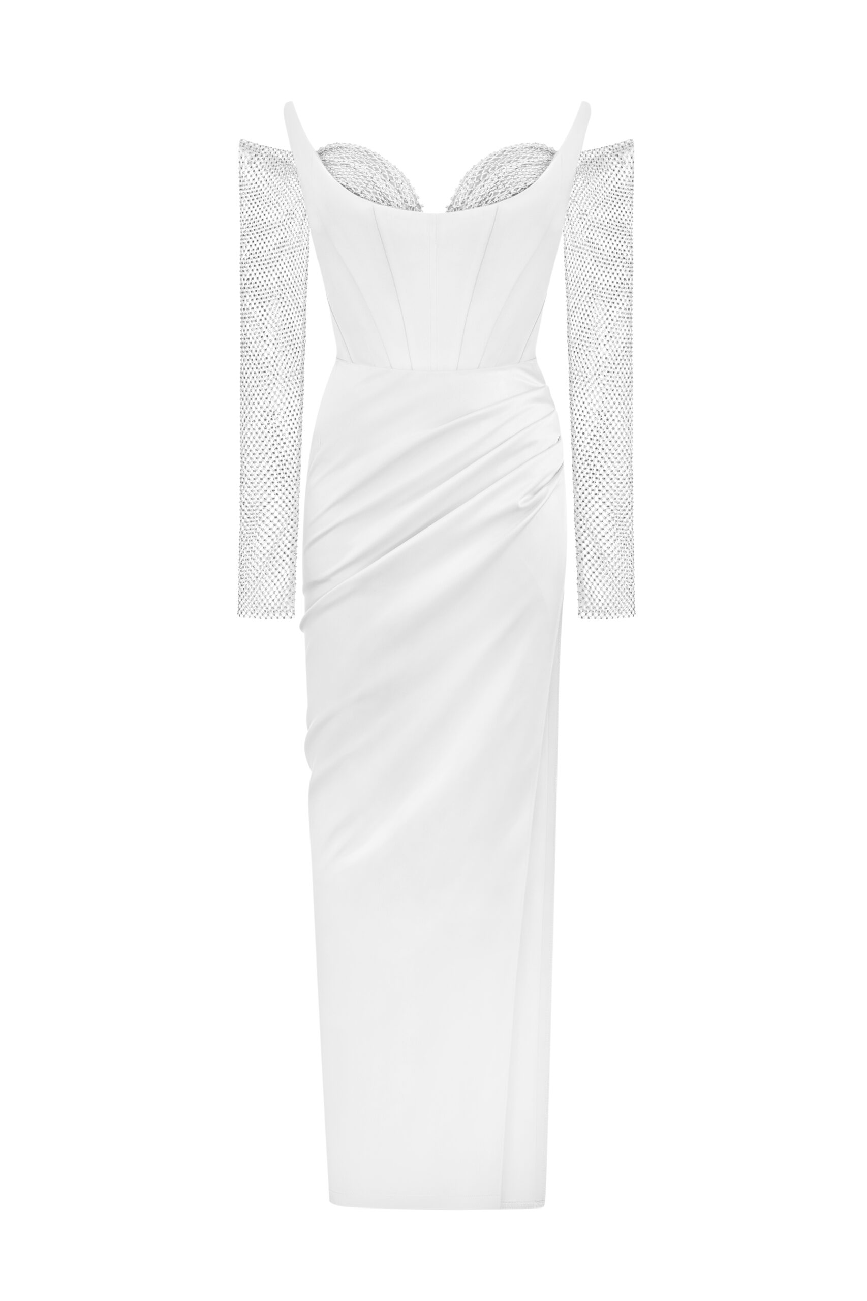 Сукня на корсетній основі та еластичною сіткою зі стразами на рукавах.