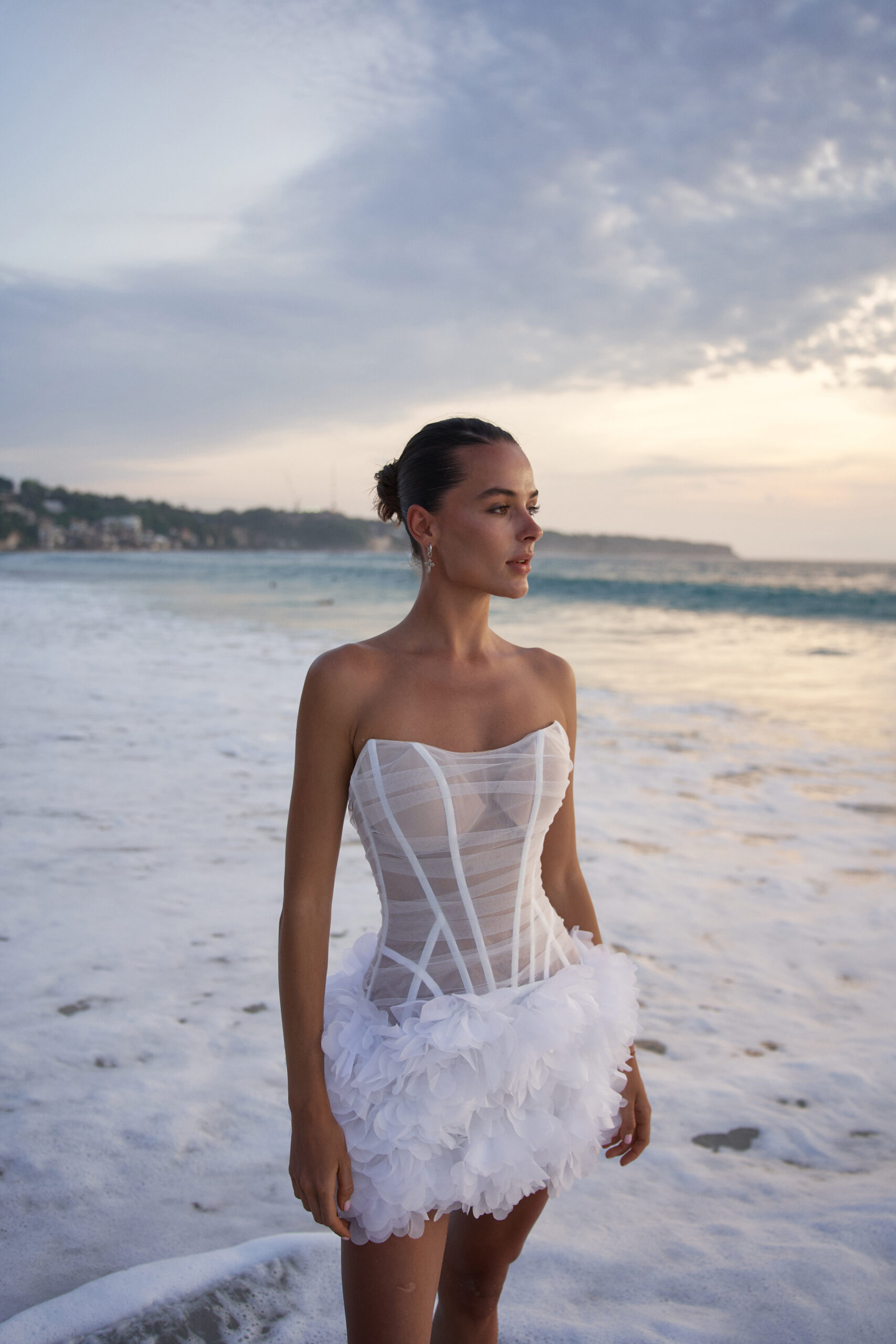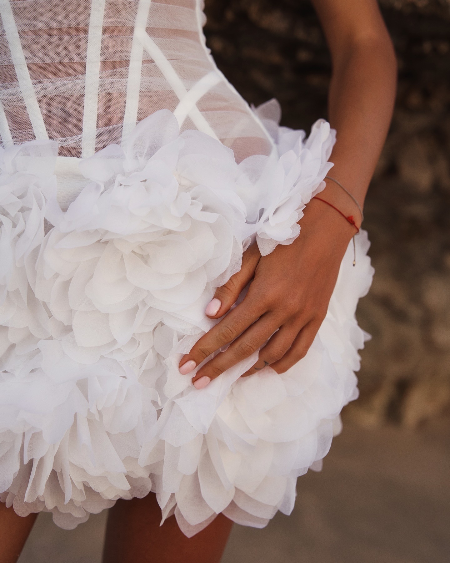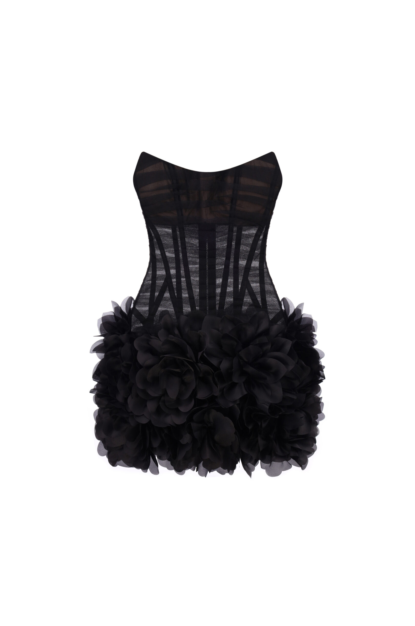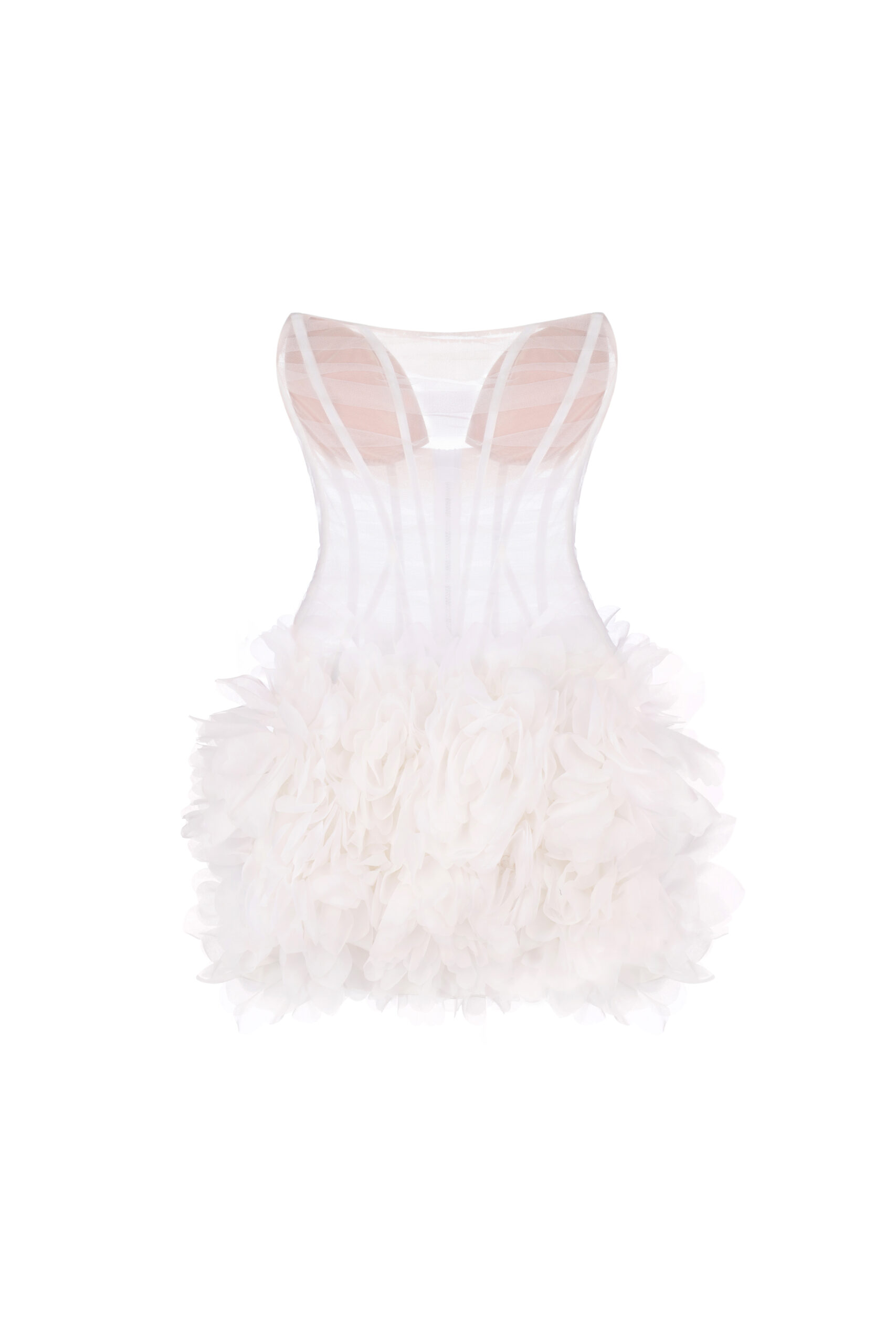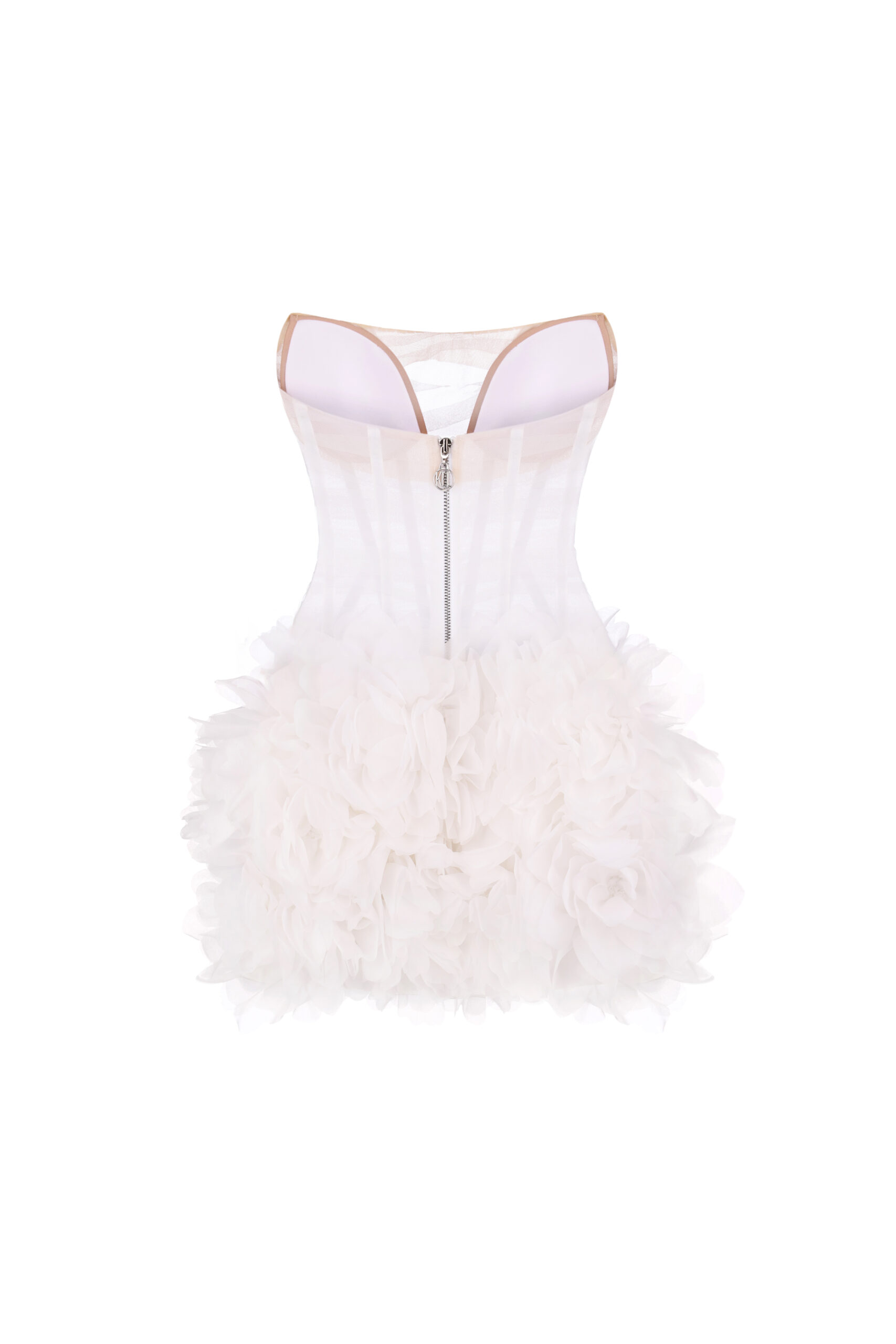 Сукня має гнучкі металеві кісточки, які формують елегантний силует. Об’ємна спідниця з багатошаровими квітковими аплікаціями створює ефект 3D. Застібка-блискавка розташована на спинці.