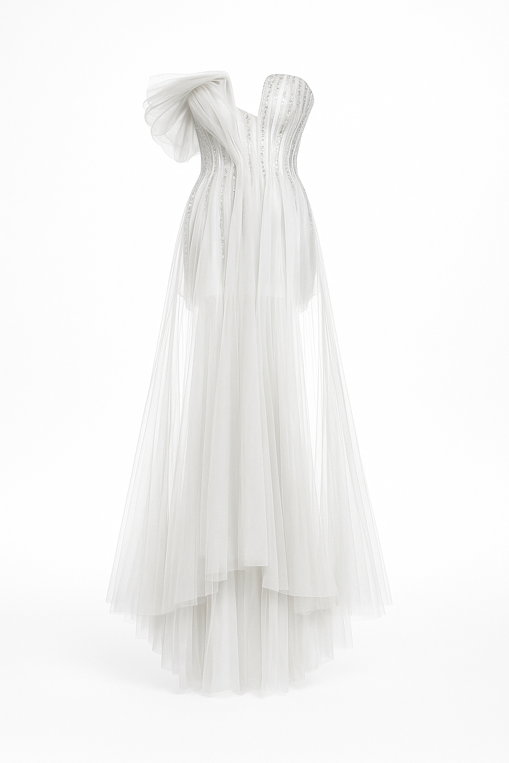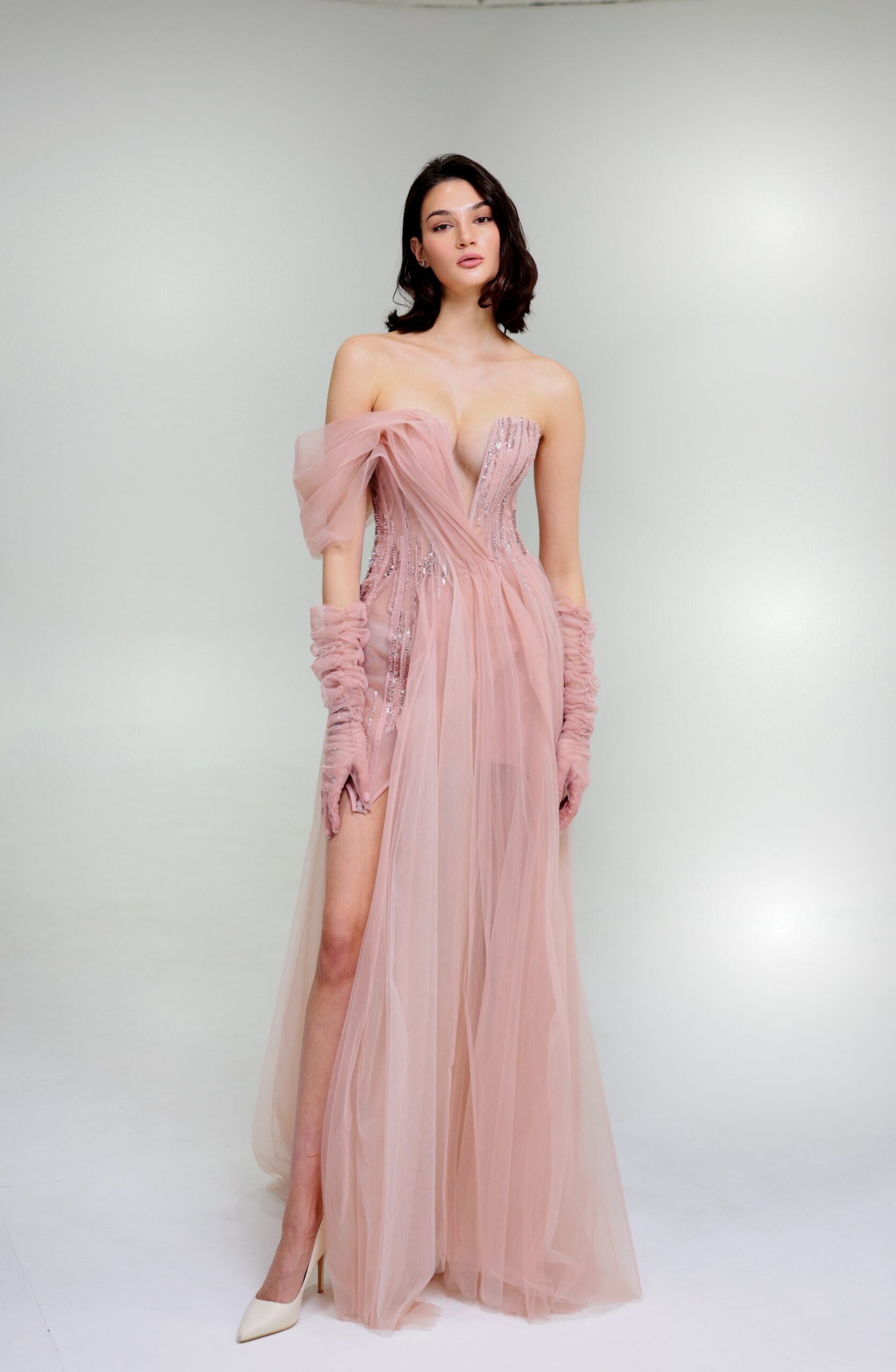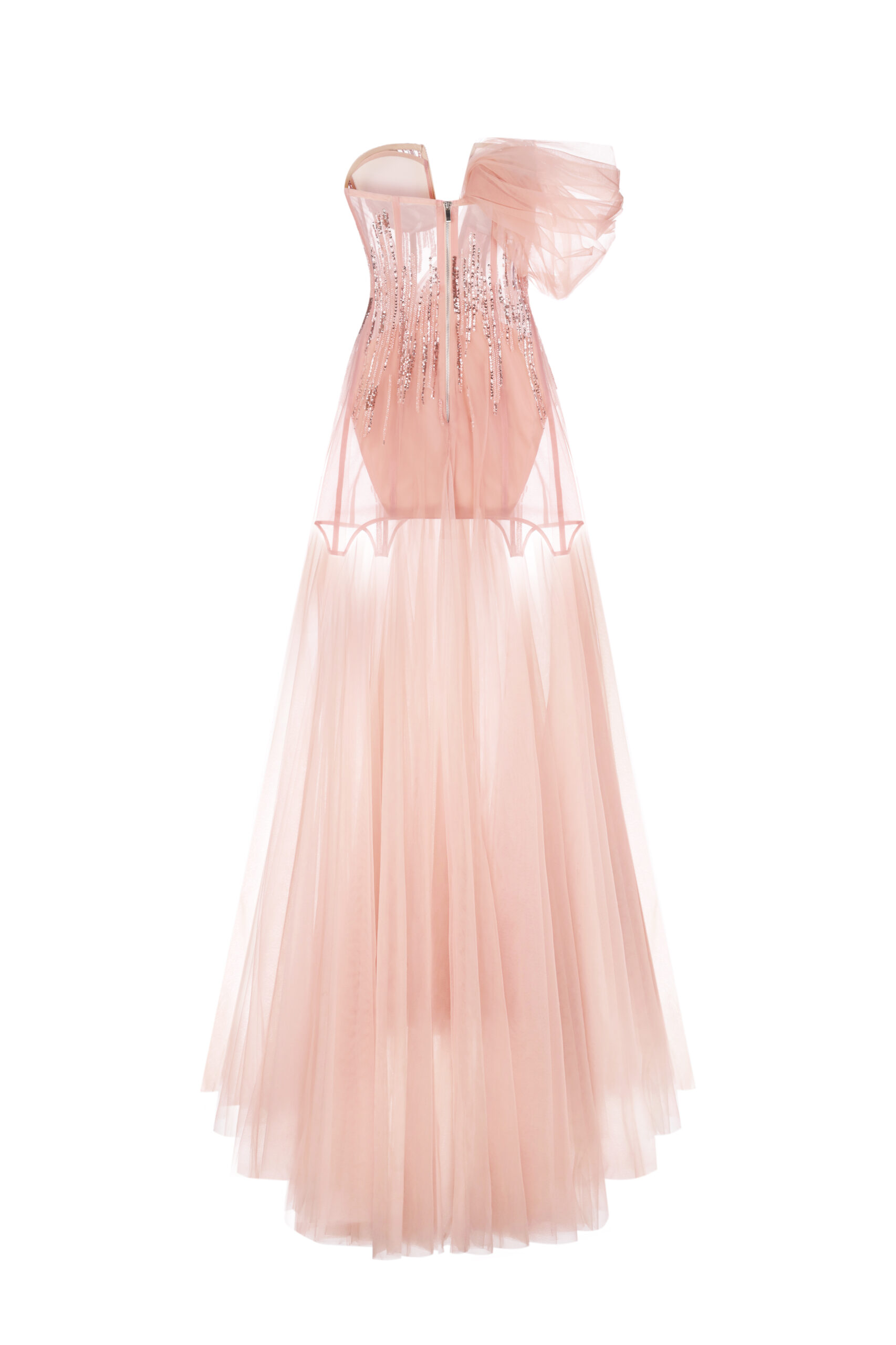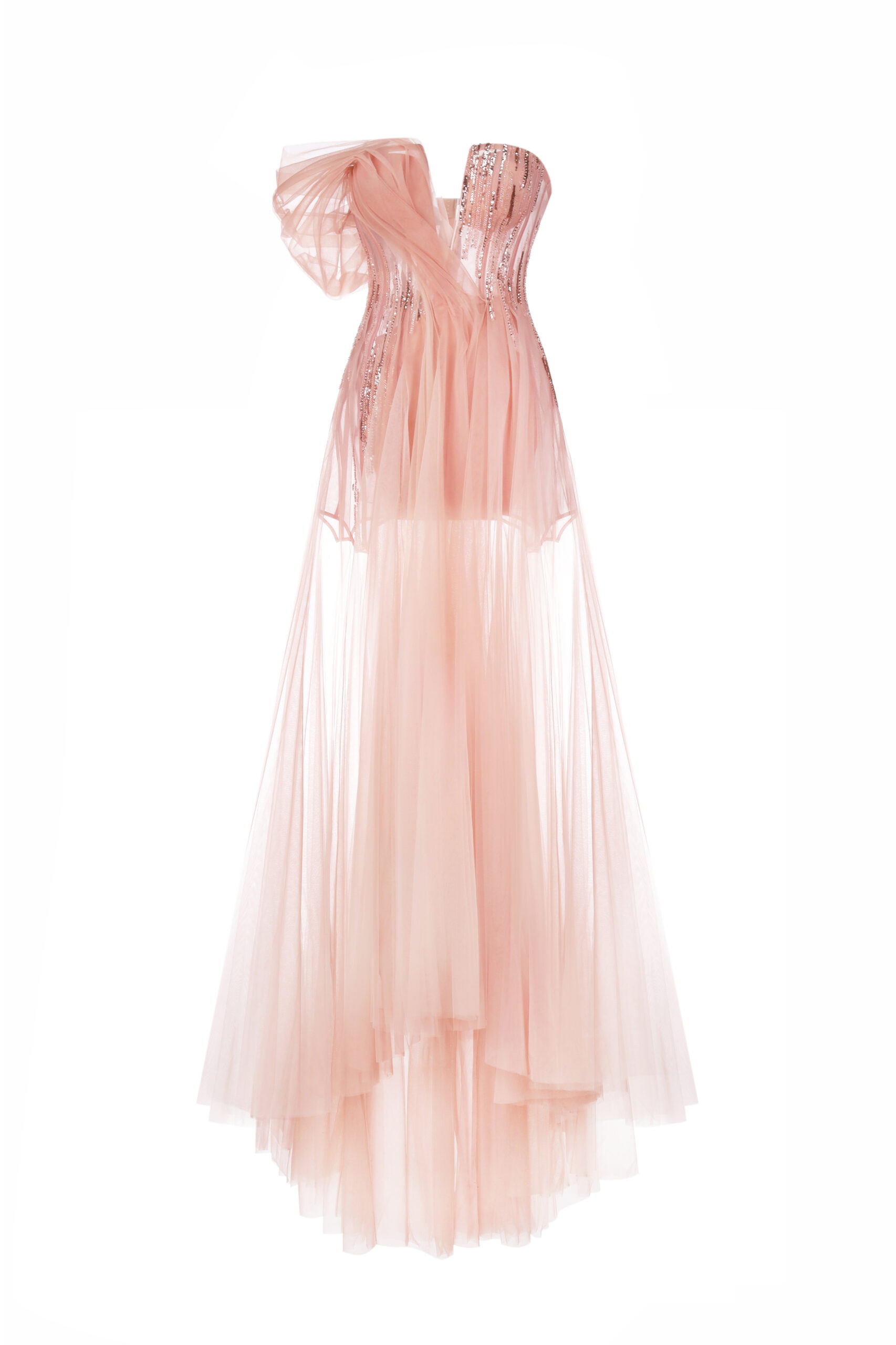 Розкішна вечірня сукня ніжно-рожевого кольору, що вражає своєю витонченістю. Асиметричний корсет із сяючим декором підкреслює жіночність, а легкий багатошаровий фатин додає образу невагомості. Завдяки елегантному крою та граціозному силуету ця сукня стане ідеальним вибором для урочистих подій.
