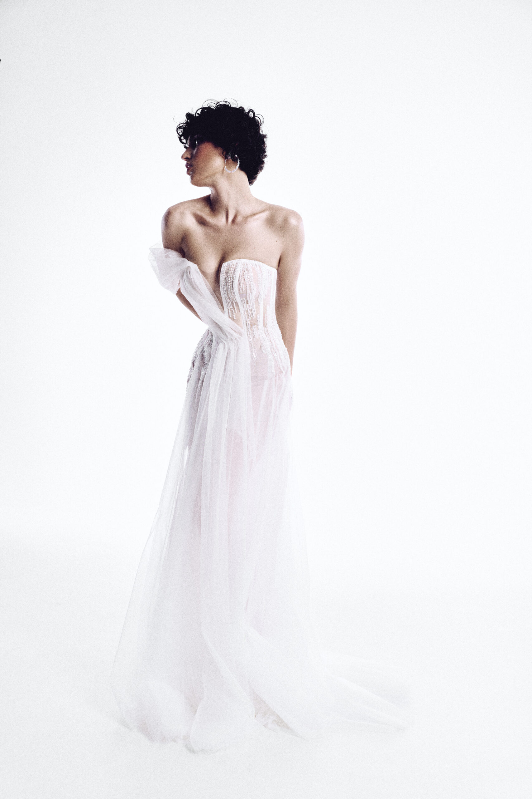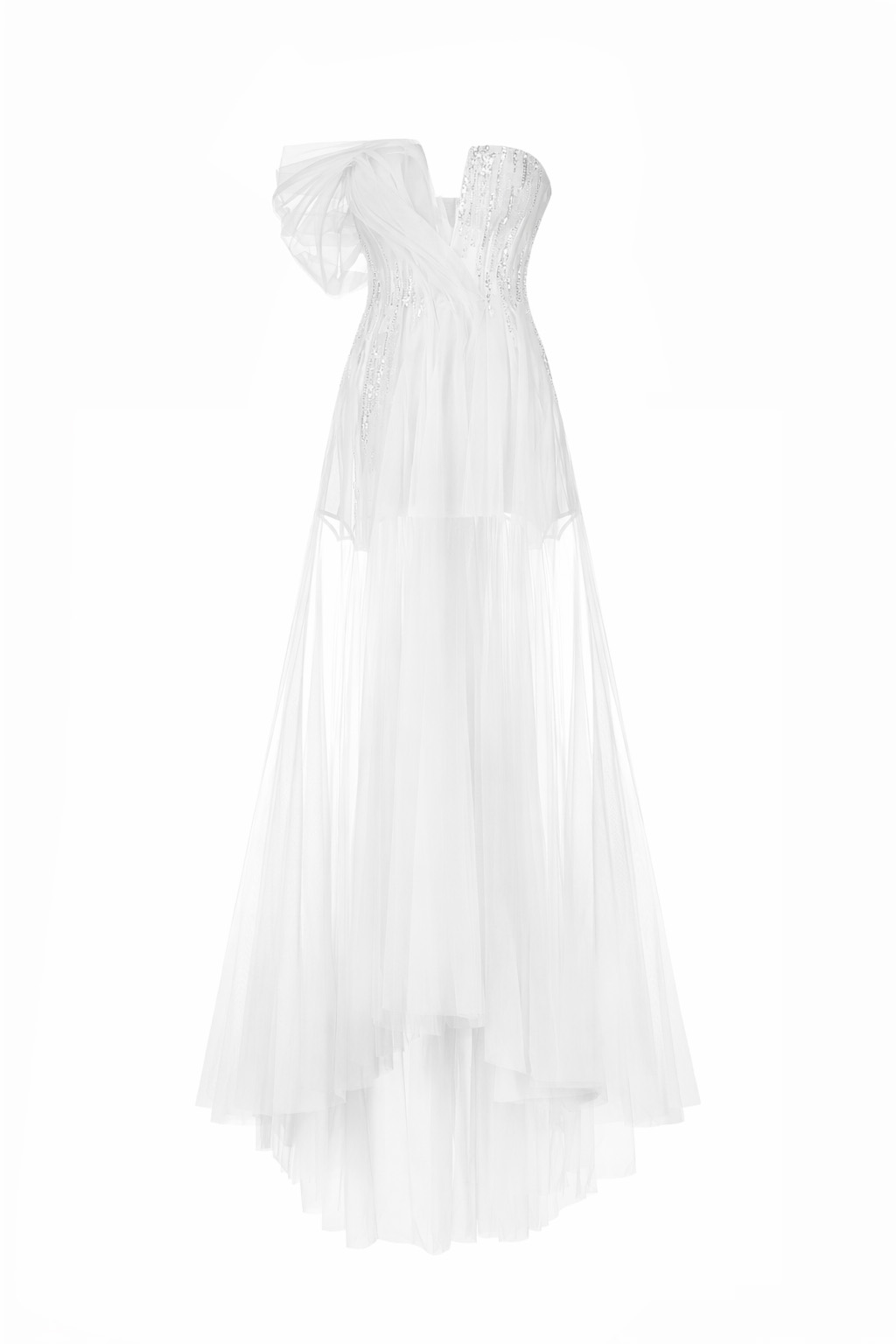 Розкішна вечірня сукня білого кольору, що вражає своєю витонченістю. Асиметричний корсет із сяючим декором підкреслює жіночність, а легкий багатошаровий фатин додає образу невагомості. Завдяки елегантному крою та граціозному силуету ця сукня стане ідеальним вибором для урочистих подій чи весілля.