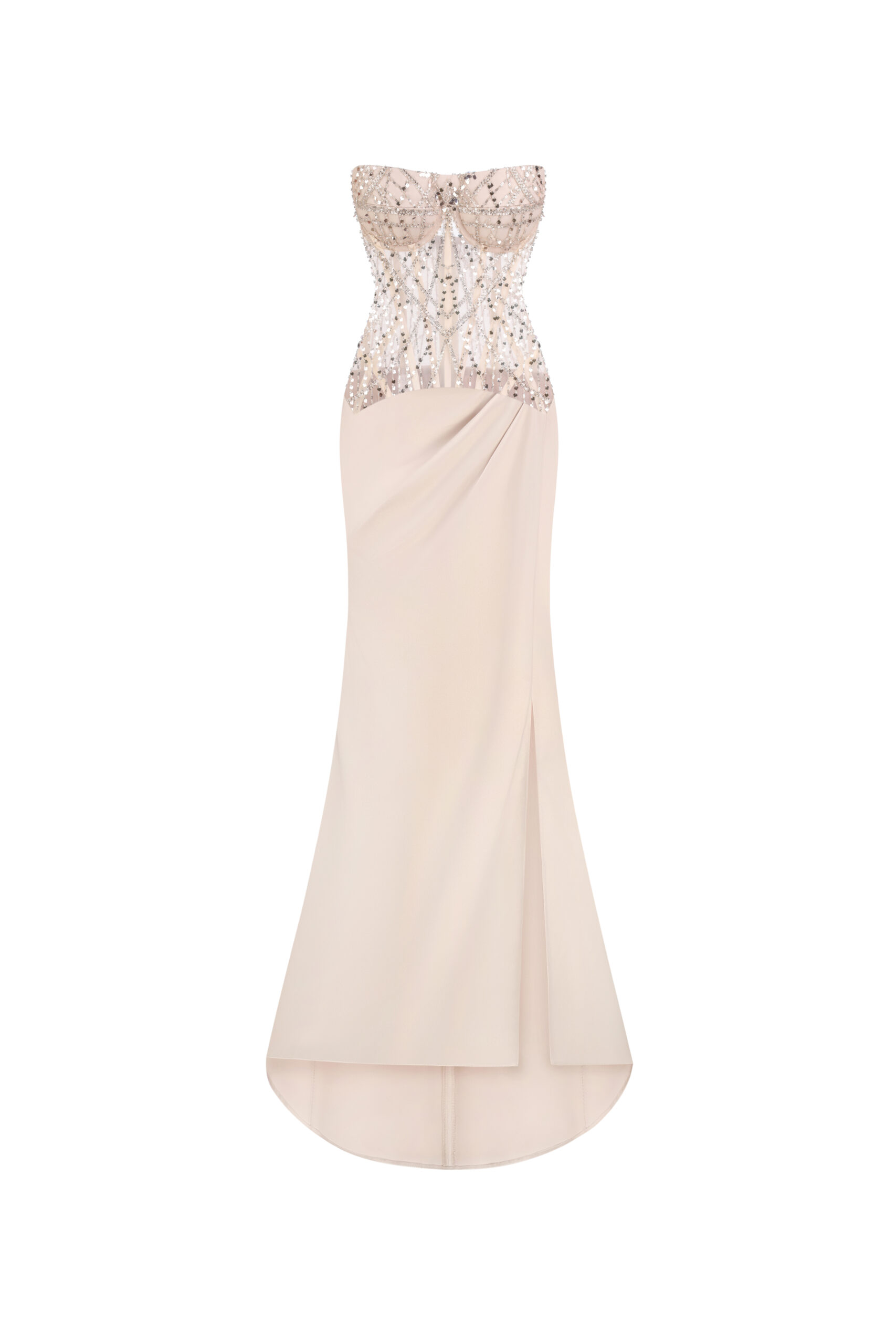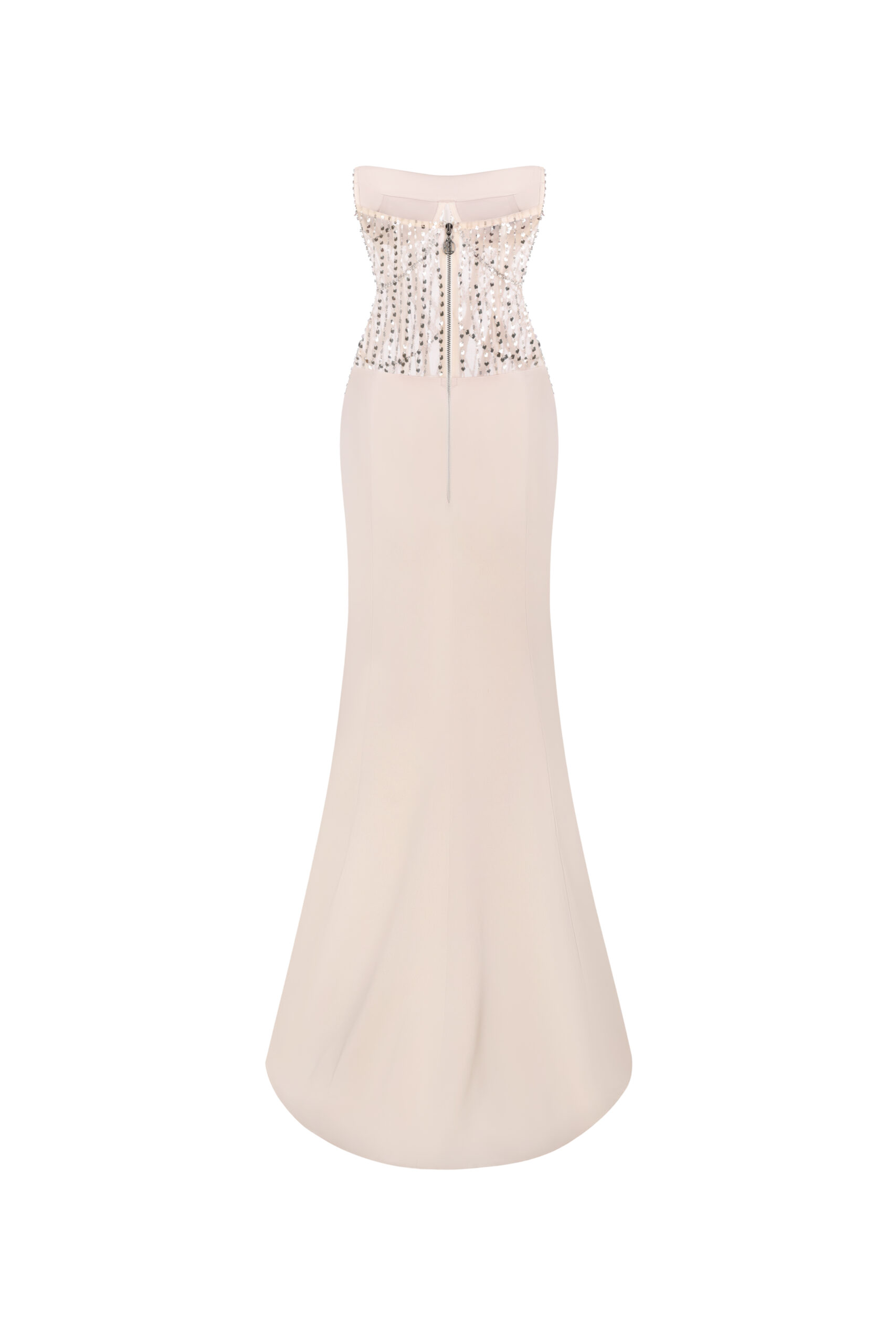 Елегантна вечірня сукня з розшитим корсетним верхом і витонченою довгою спідницею створює жіночний і благородний силует. Ніжний бежевий відтінок у поєднанні з блискучим декором додає образу легкого сяйва. Ідеально підходить для урочистих подій, гала-вечорів та святкових заходів.