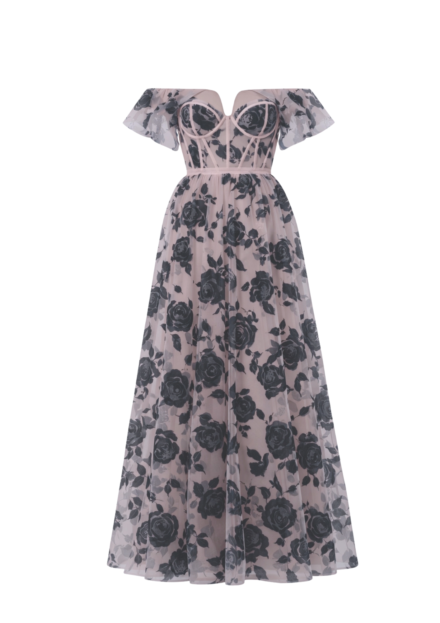 Розкішна вечірня сукня з напів-прозорої тканини, прикрашена оксамитовими квітковими візерунками. Відкритий корсетний верх із м’якими крильцями-манжетами на плечах додає образу елегантності, а пишна спідниця підкреслює витонченість стилю. Ідеальна для створення вражаючого лука на святкових заходах.