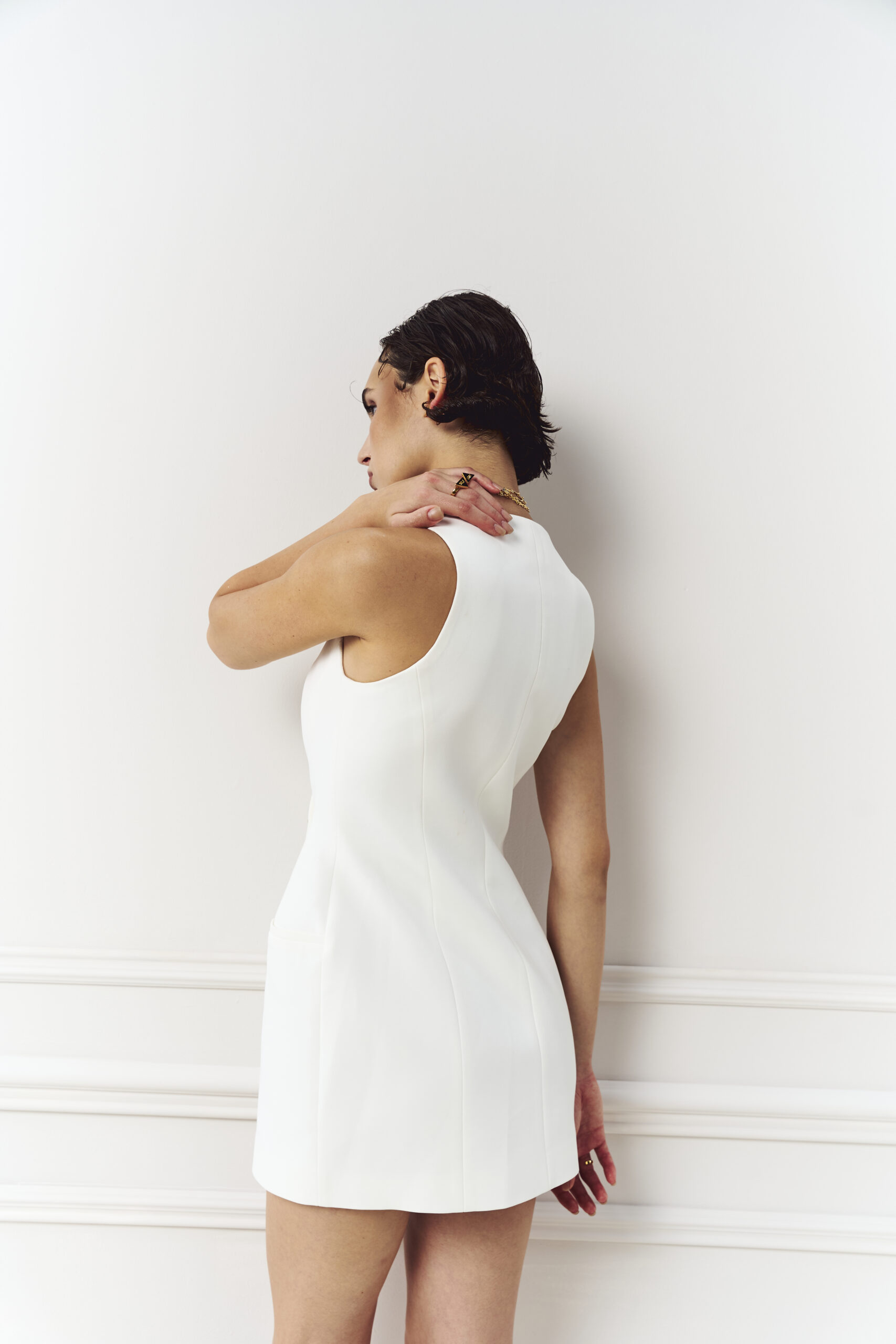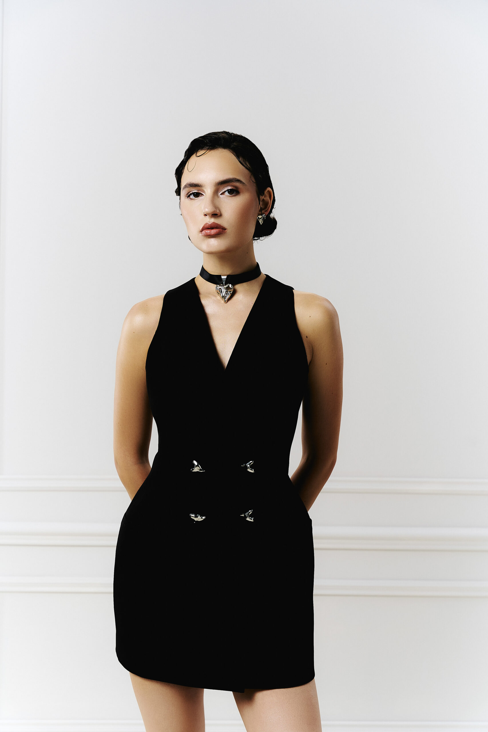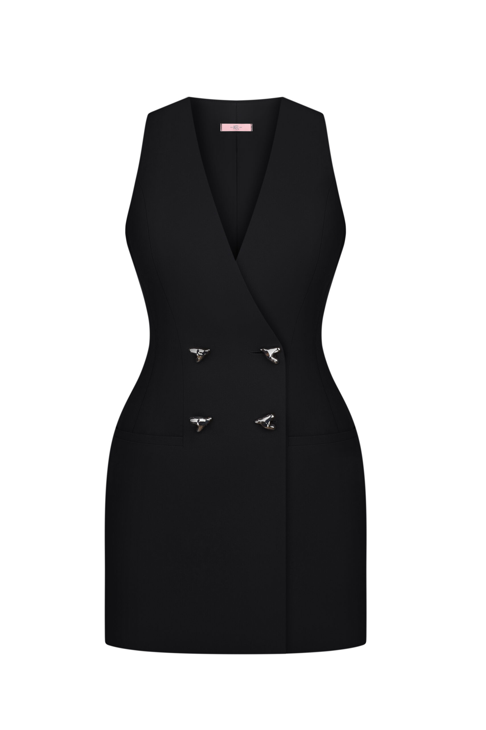 Стильна міні-сукня в форматі жилета з двобортним кроєм. Чітко окреслений силует робить акцент на талії, а металеві ґудзики додають трендового характеру. Сукня універсальна — її можна носити соло або комбінувати з блузами та гольфами. Ідеально підходить як для ділових зустрічей, так і для модних вечірок.