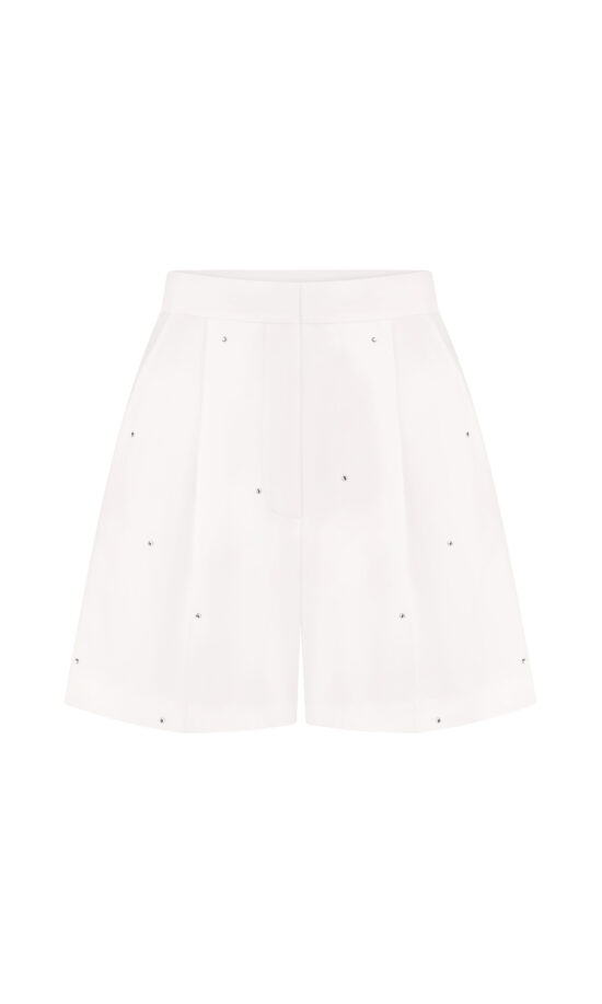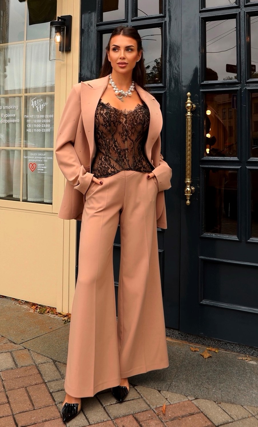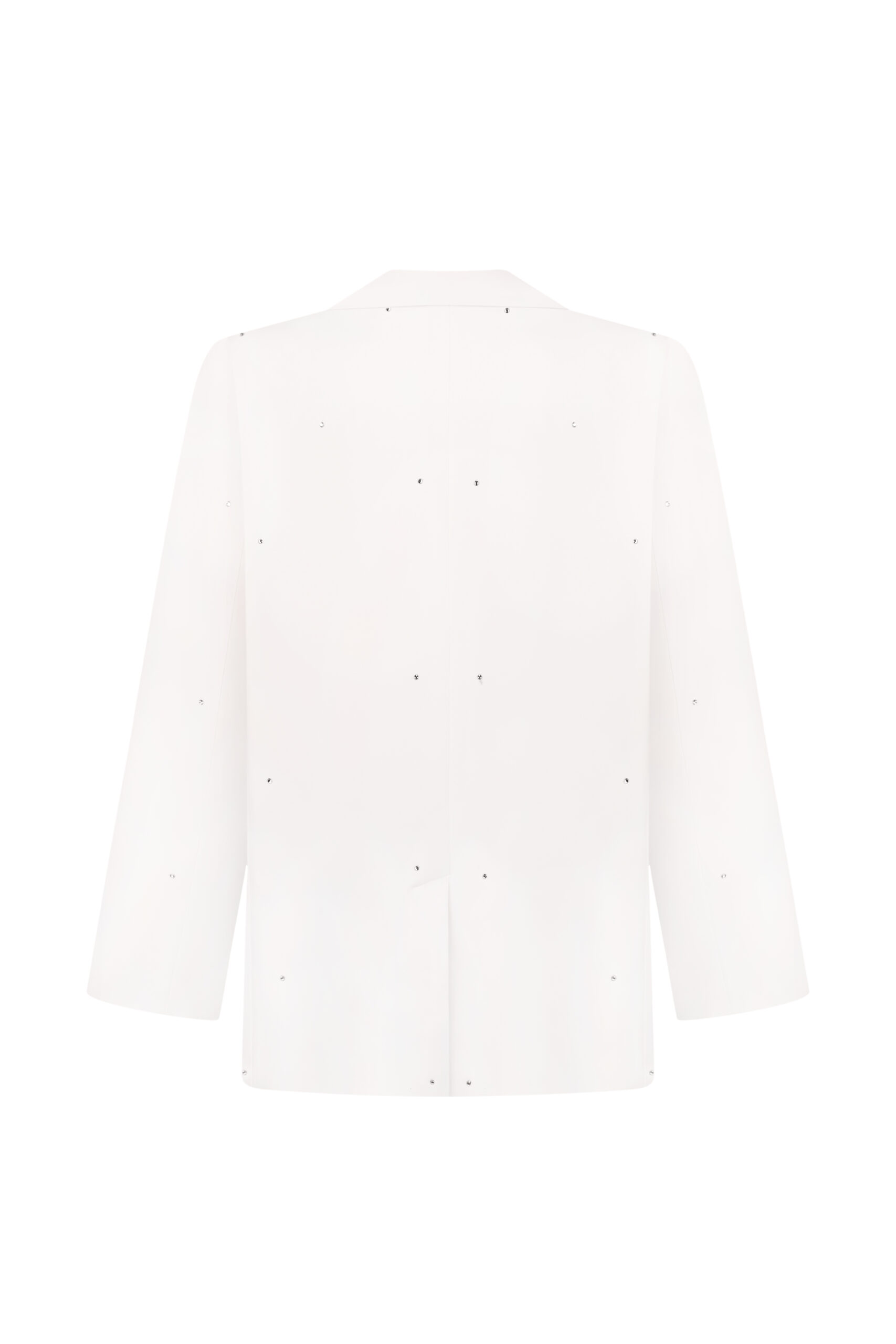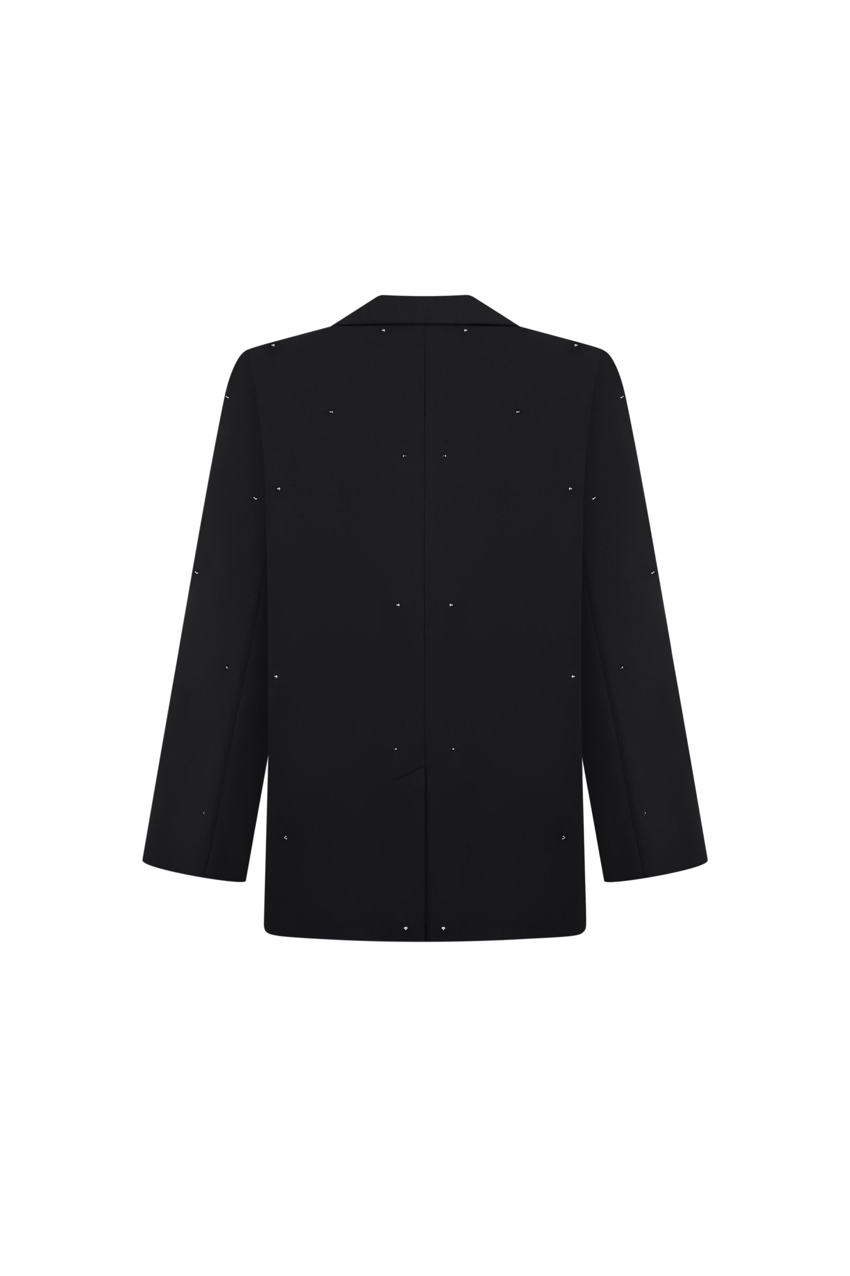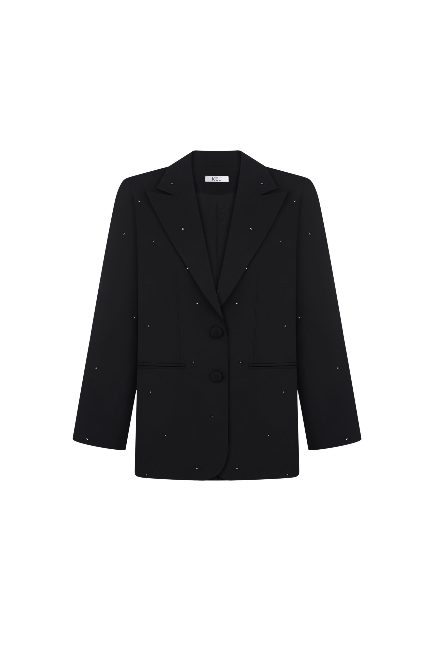 Елегантна модель жакету класичного вільного крою, прикрашена дрібними стразами, що додають виробу вишуканого блиску. Ідеально підходить для урочистих подій або вечірніх виходів, поєднуючи стриманість та розкіш. Два ґудзики і прямий фасон створюють лаконічний силует, що вдало доповнює будь-який образ.